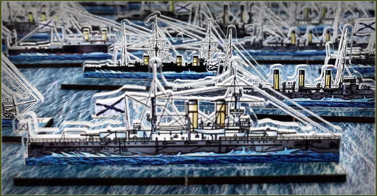 The Battle of Tsushima is one of the most decisive naval engagements in history. The collection includes Japanese and Russian fleets. The lengths of most ships (battleships, cruisers, destroyers) vary from 8.5 cm to 10.5 cm (approx 1:1400 scale). The Japanese Torpedo ships have around 5.5 cm in length..