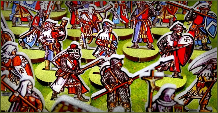 Illustrated by Vyacheslav Batalov, a skilled artist renowned for his expertise in creating individual miniatures for skirmish scenarios, each figure in this collection showcases his unique artistic style. Inspired by traditional flat metal figurine techniques, Batalov adopts a distinctive side perspective, emphasizing the colorful details of medieval armor, banners, and weaponry. His face/verso printing approach ensures each miniature has unique designs on both sides, adding depth and dynamic visual appeal to your tabletop miniatures.