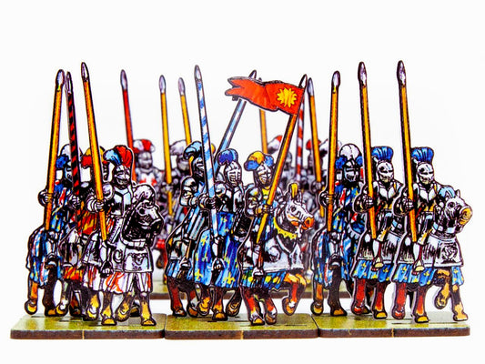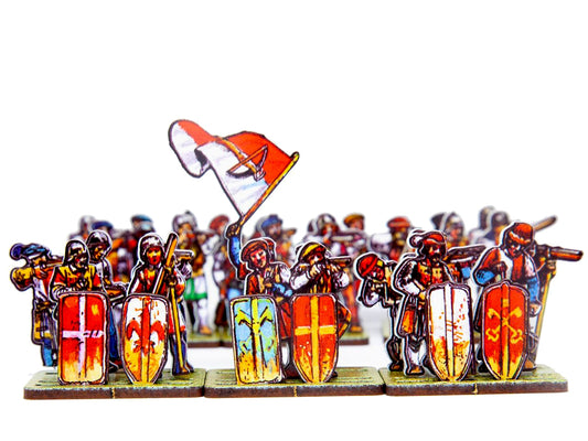 Illustrated by Peter Denis, the miniatures in this collection epitomize his masterful artistry tailored for tactical wargaming. Each double-printed figure brings life to historical narratives through vibrant, detailed designs. Peter Denis employs a bold use of color with sharp, clean lines to ensure figures stand out on the battlefield. Intricate shading and fine detailing highlight weaponry, banners, and armor, offering a striking level of historical accuracy while maintaining an engaging aesthetic appeal.