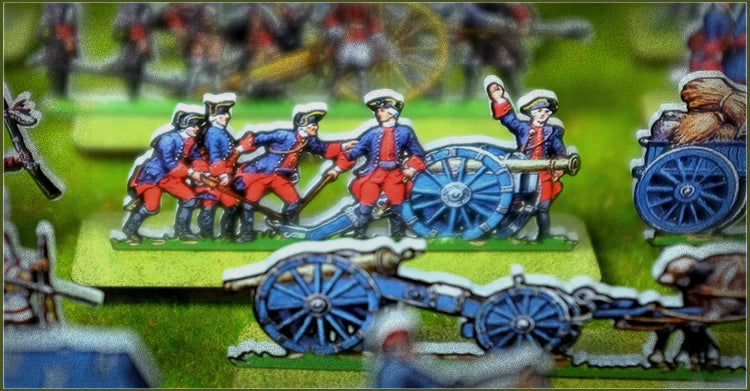 The collection features a broad spectrum of troop types essential to the warfare of the Seven Years’ War. The disciplined Prussian grenadiers and line infantry are juxtaposed with the spirited charges of their cavalry, including hussars and dragoons. The Austrians contribute their multi-ethnic regiments, with intricate uniforms reflecting their imperial diversity, while the French regiments showcase elegant and visually striking designs. British forces, famed for their tenacity and innovation, bring a mix of red-coated infantry and formidable Highland regiments. Russian units add their distinct presence, with a mix of infantry and robust cavalry formations. Artillery played a crucial role in this war, and the collection includes a variety of cannon teams and limbered guns, highlighting the technological advancements and strategic importance of firepower during the conflict.