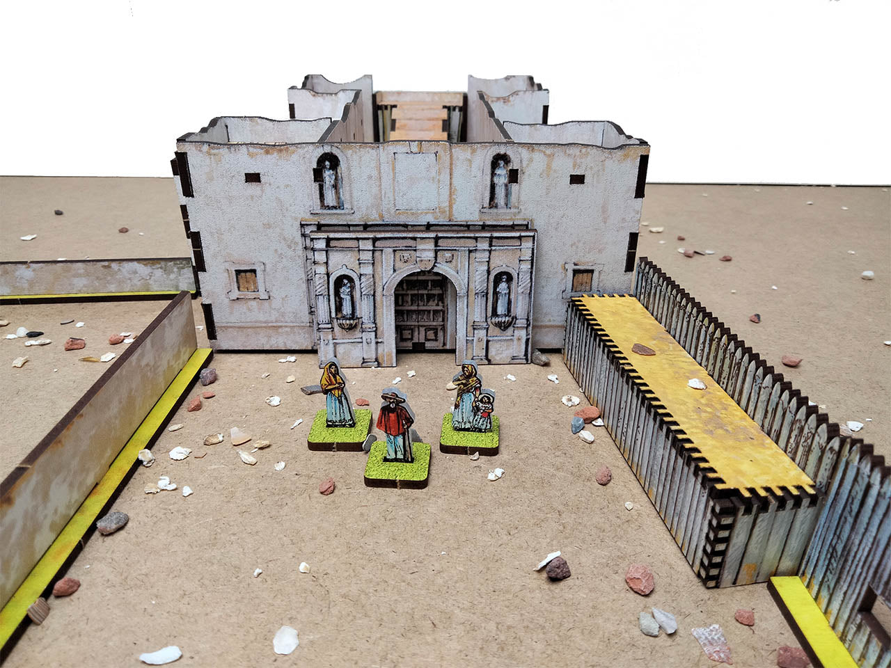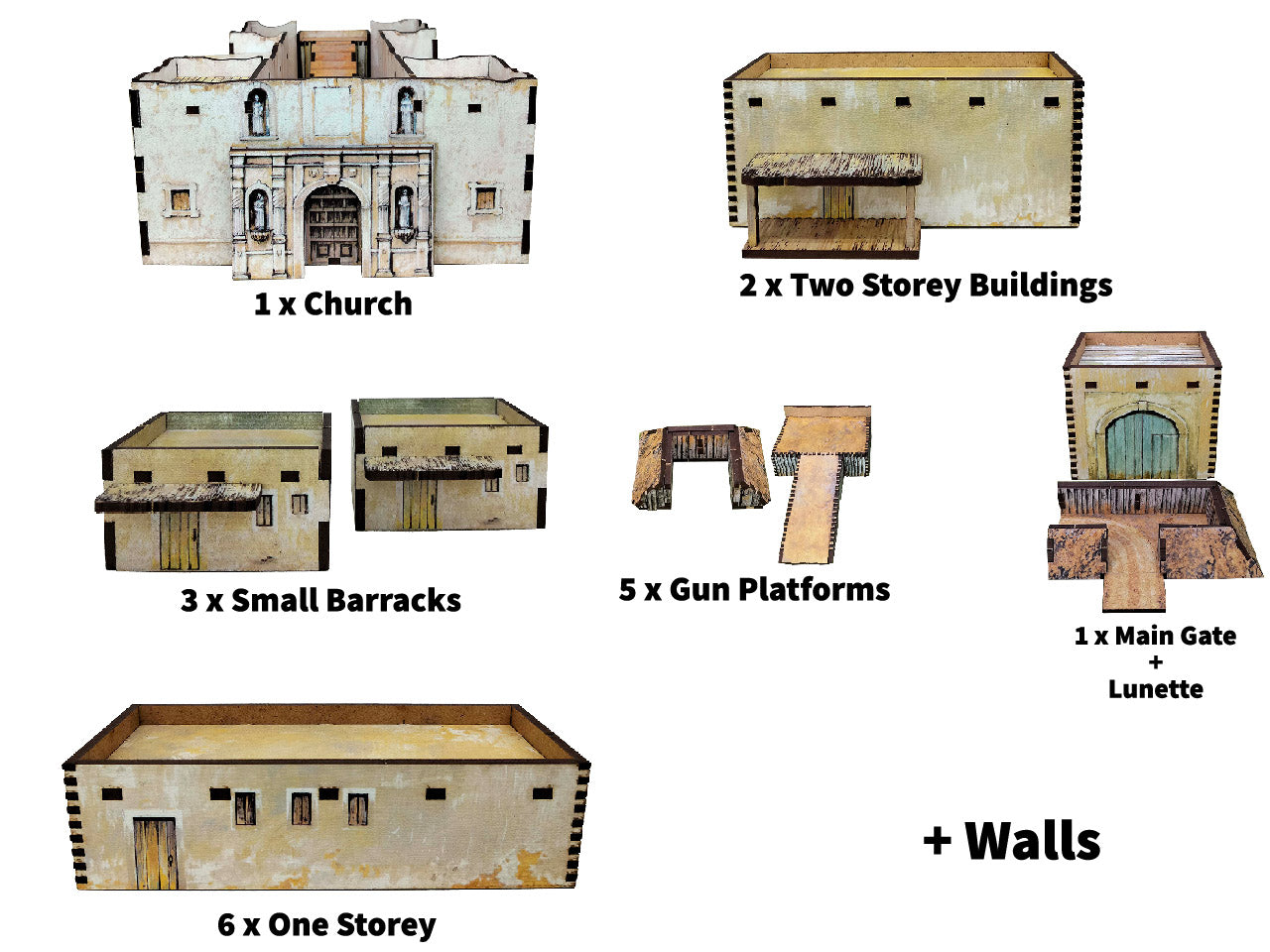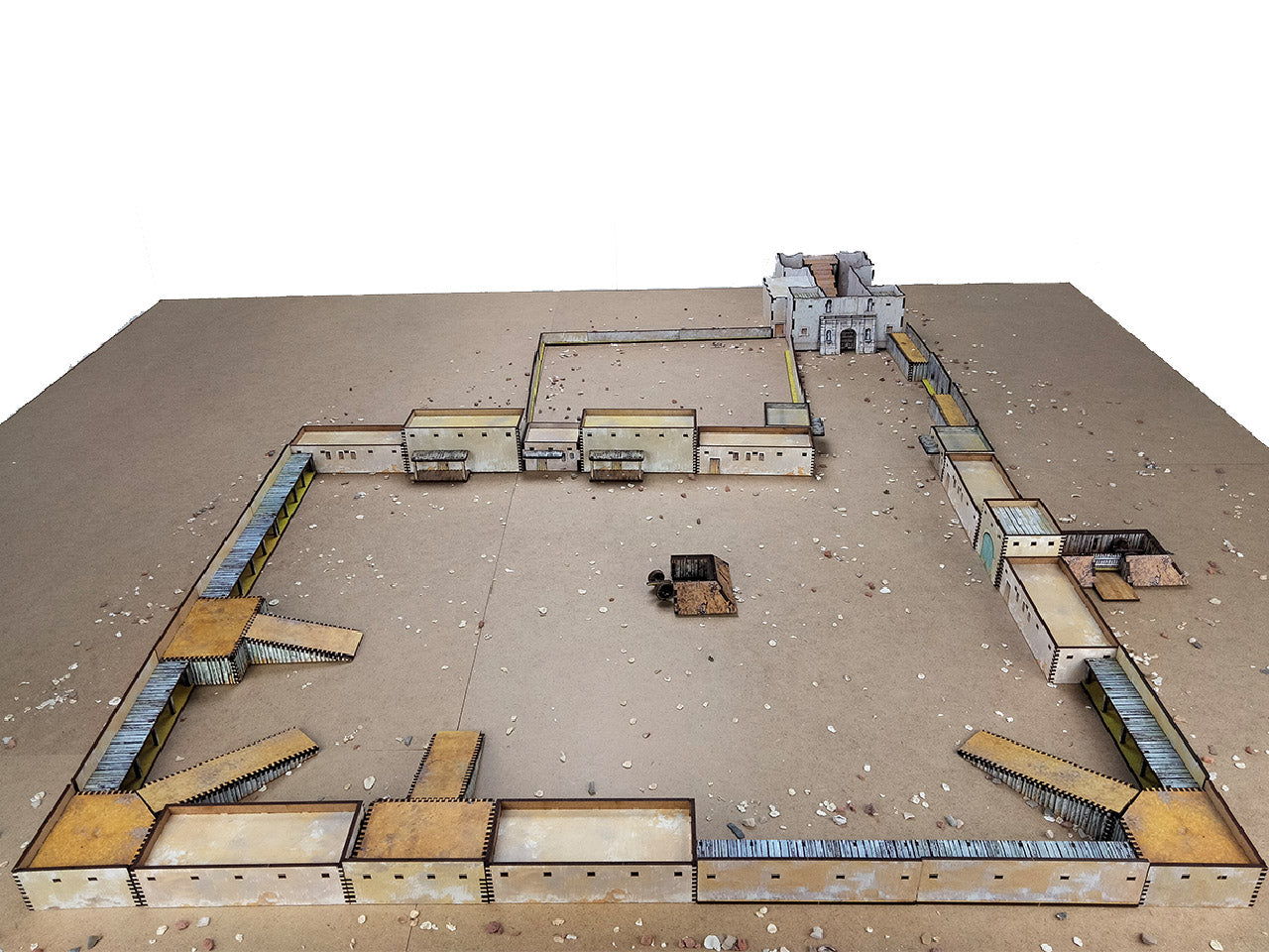 The size of the 18mm Alamo Compound is L: 73.5cm, W: 84.5cm, and H: 6.5cm. The product contains 26 sprues of MDF (20x15cm), precut and printed on both sides.
