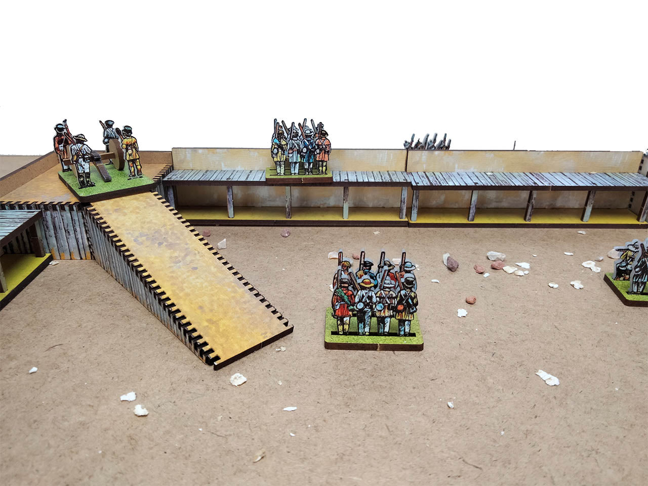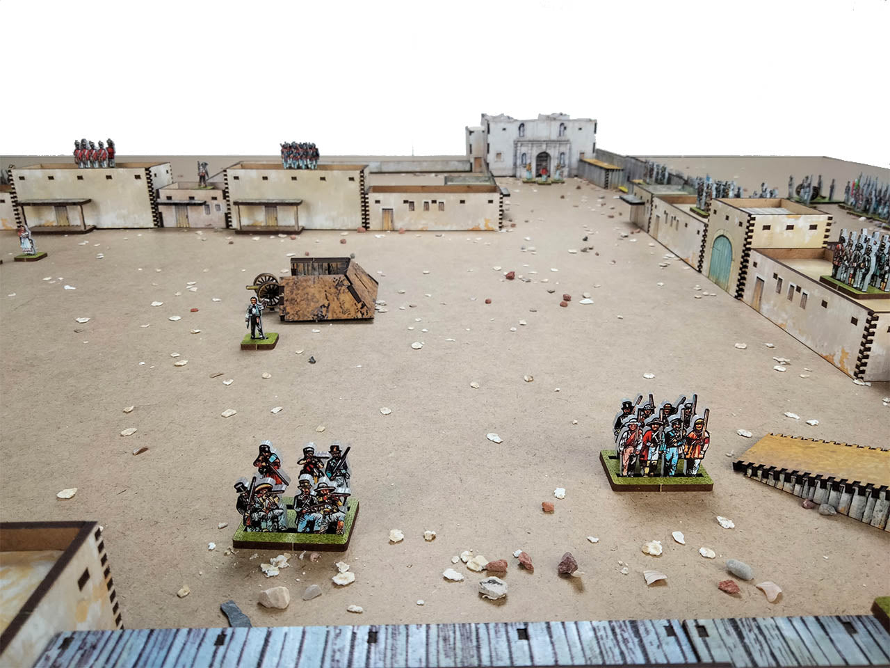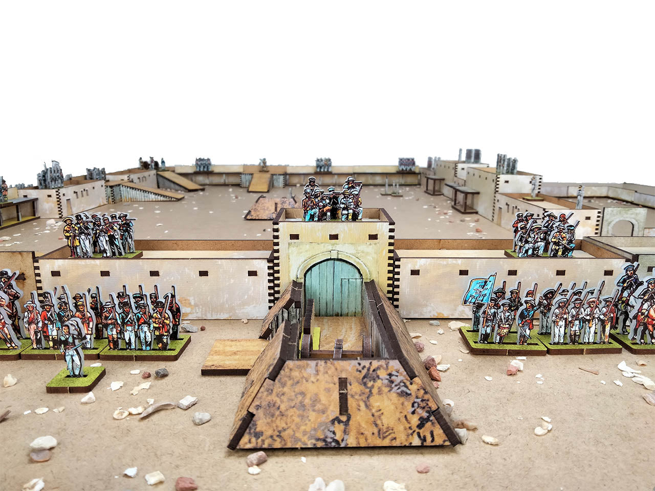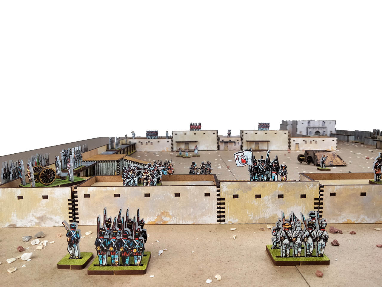 The size of the 18mm Alamo Compound is L: 73.5cm, W: 84.5cm, and H: 6.5cm. The product contains 26 sprues of MDF (20x15cm), precut and printed on both sides.