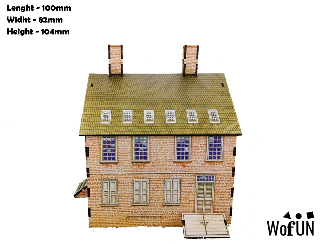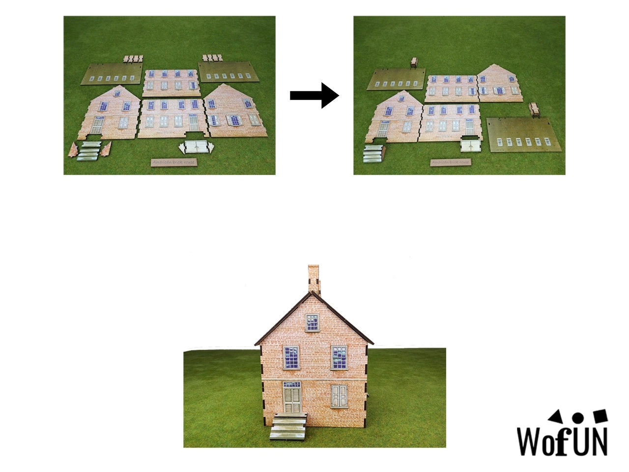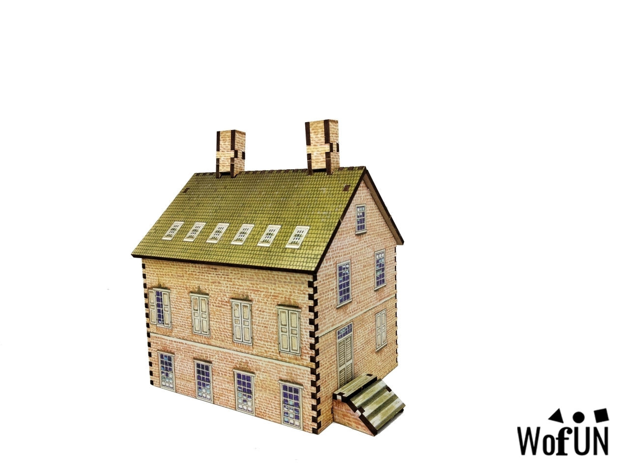 WoFun wargaming miniature buildings are produced from 2.5 mm MDF. The diorama is printed with textures, as seen in the photos, so you only need to assemble the components, and you will have, in less than an hour, a American Brick House for your games.