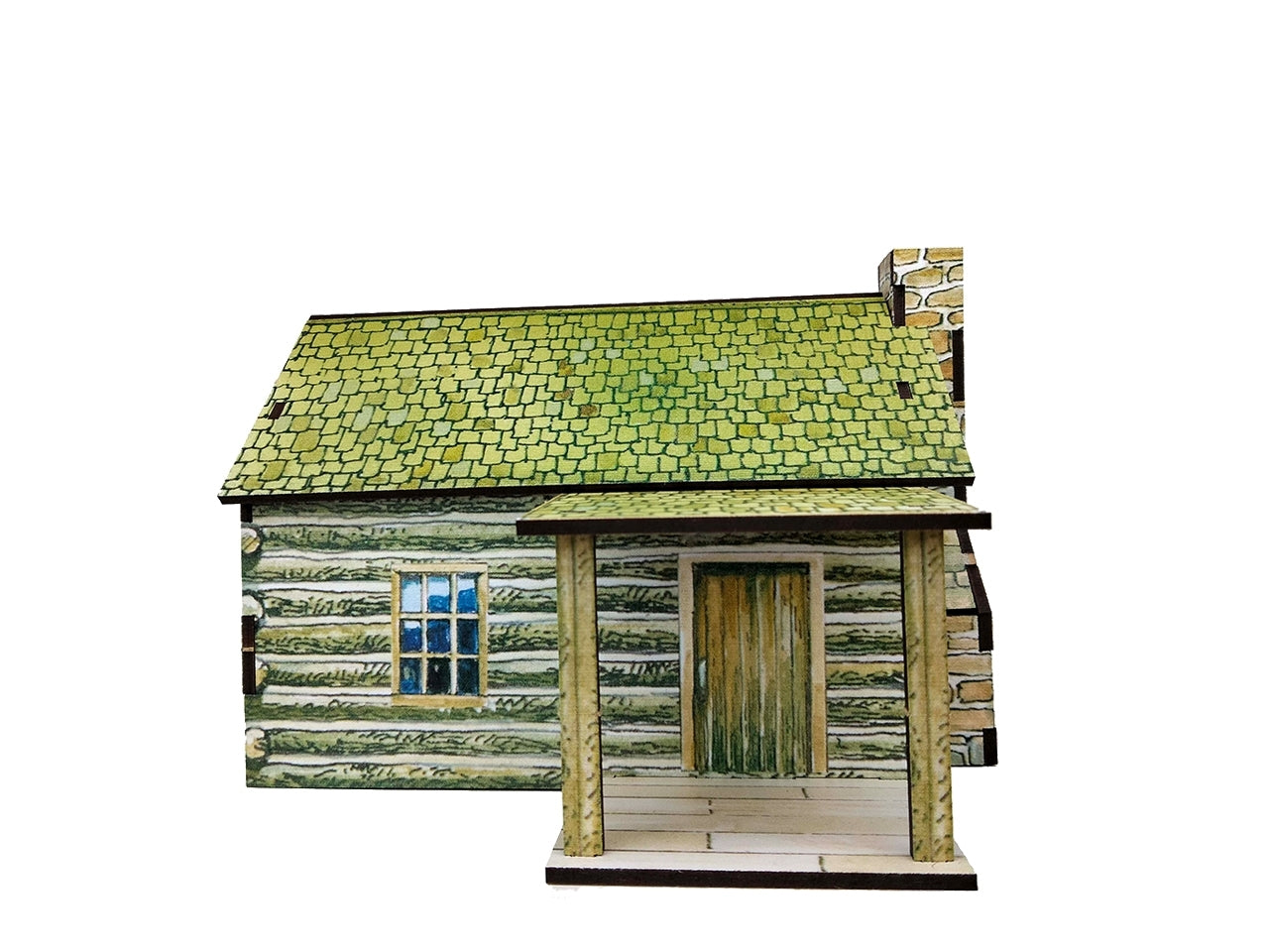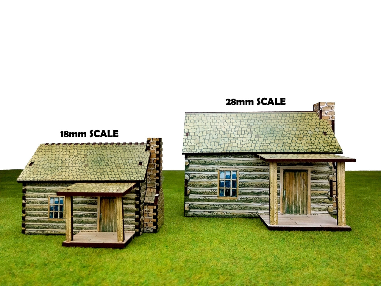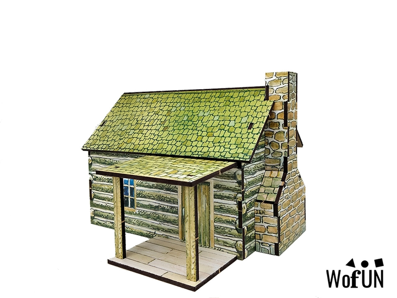 The size of the 18mm scale Log House is L: 9.4cm, W: 5.1cm, and H: 7.1cm. The product contains two 20x15cm sprues of MDF precut and printed on one side.