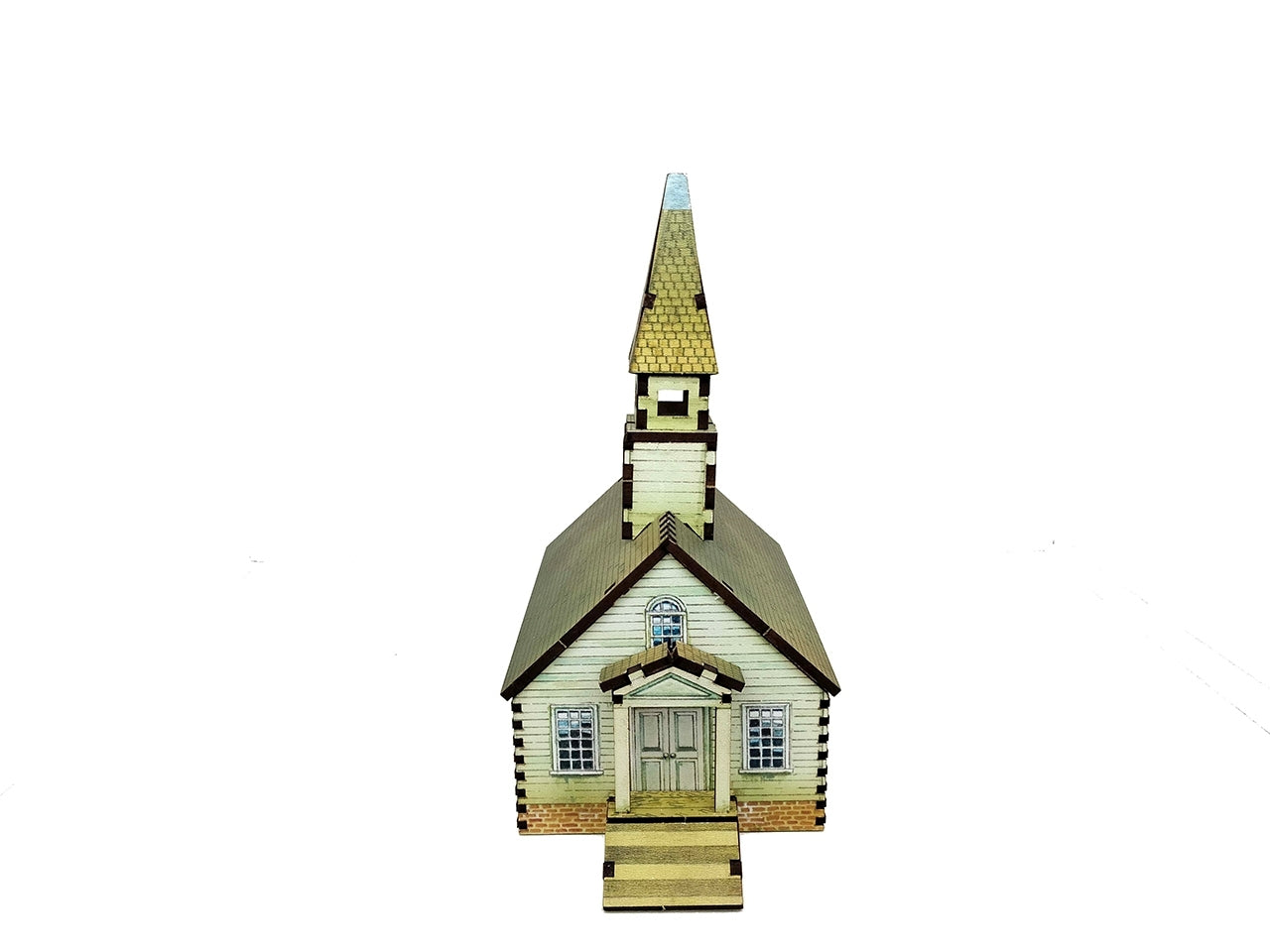 The size of the 18mm scale Small Church is L: 11.8cm, W: 8.3cm, and H: 16.5cm. The product contains three 20x15cm sprues of MDF precut and printed on one side.