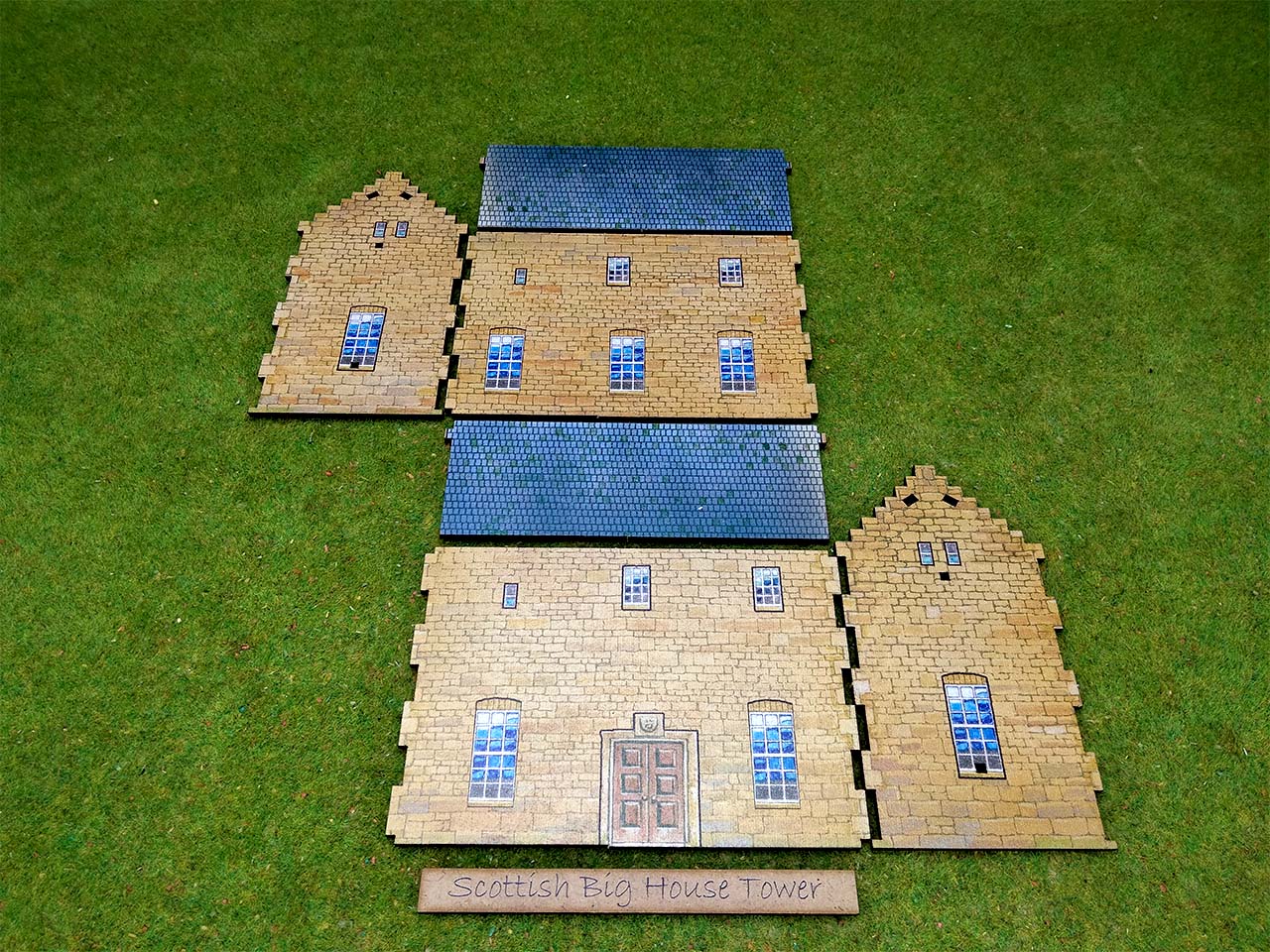 The size of the 28mm scale Scottish Big House is L: 25.4cm, W: 9.6cm, and H: 22.1cm. The product contains four 30x20cm sprues of MDF precut and printed on one side.