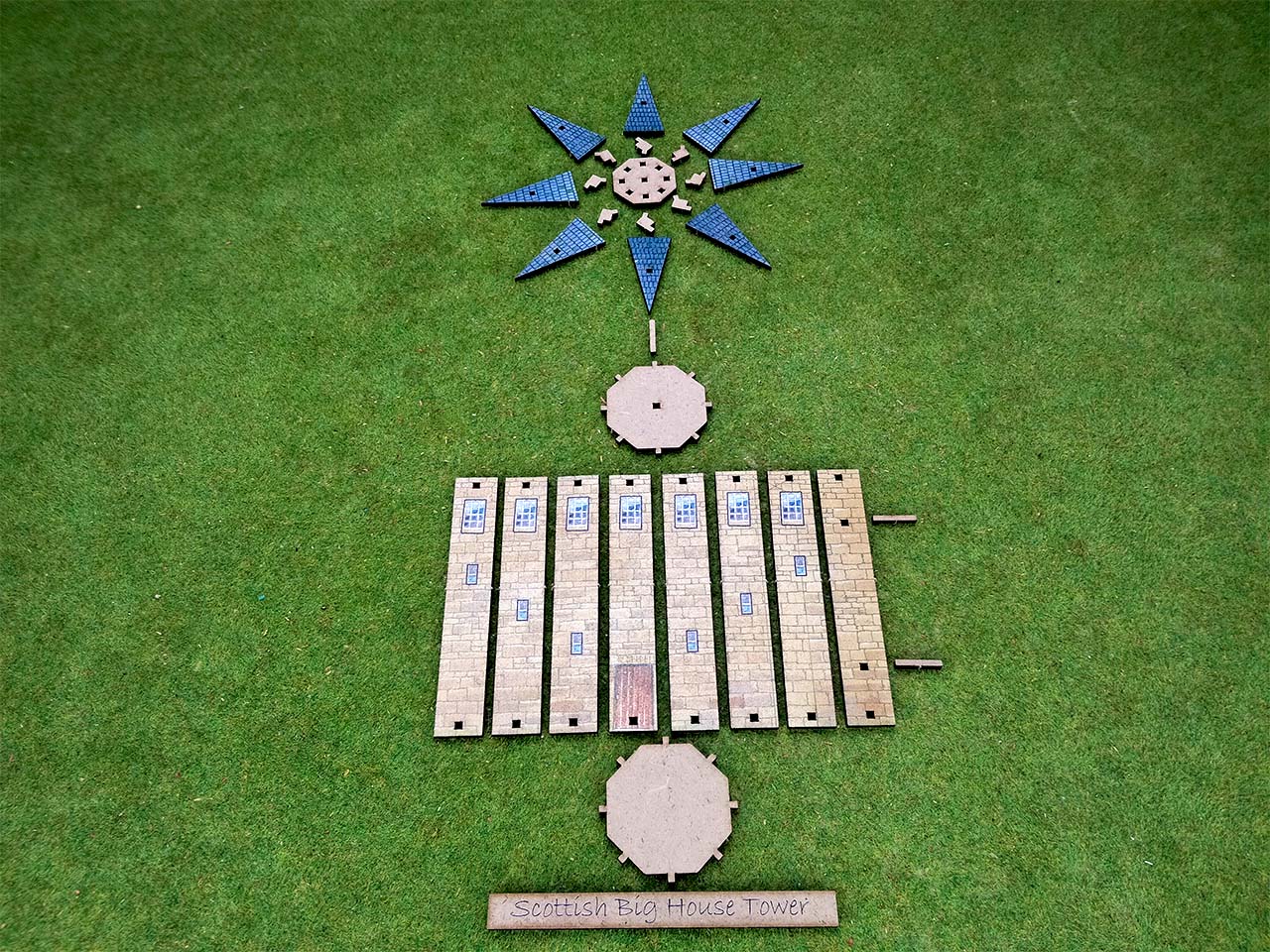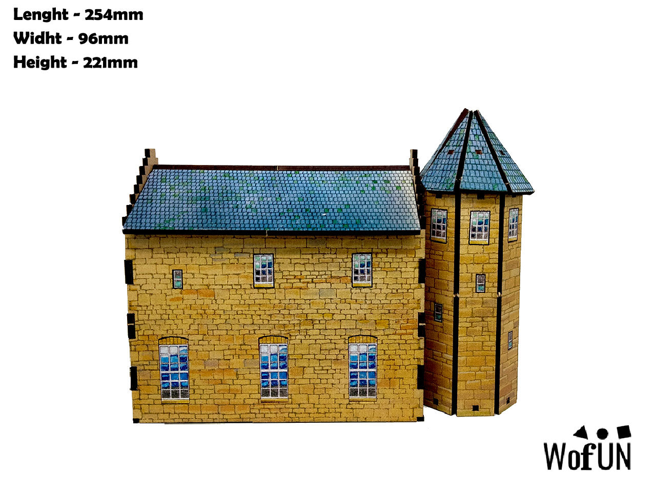 WoFun wargaming miniature props are produced from 2.5 mm MDF. The diorama is printed with textures, as seen in the photos, so you only need to assemble the components to get a Scottish Big House for your games in less than 5 minutes.