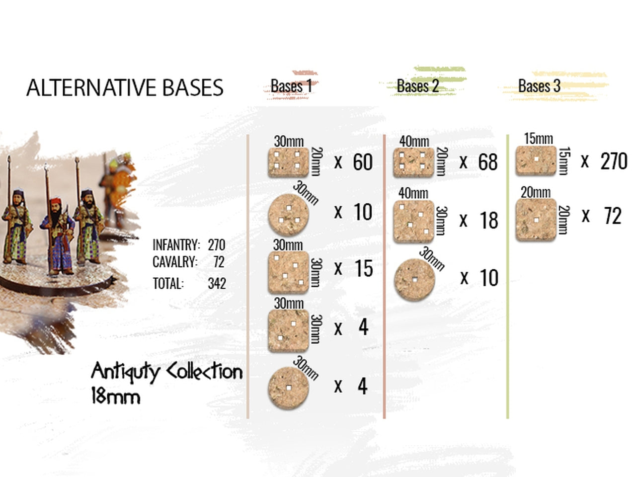 • Bases 2: 15 mm, 20 mm, and 40 mm frontage; 1 infantry mini per base