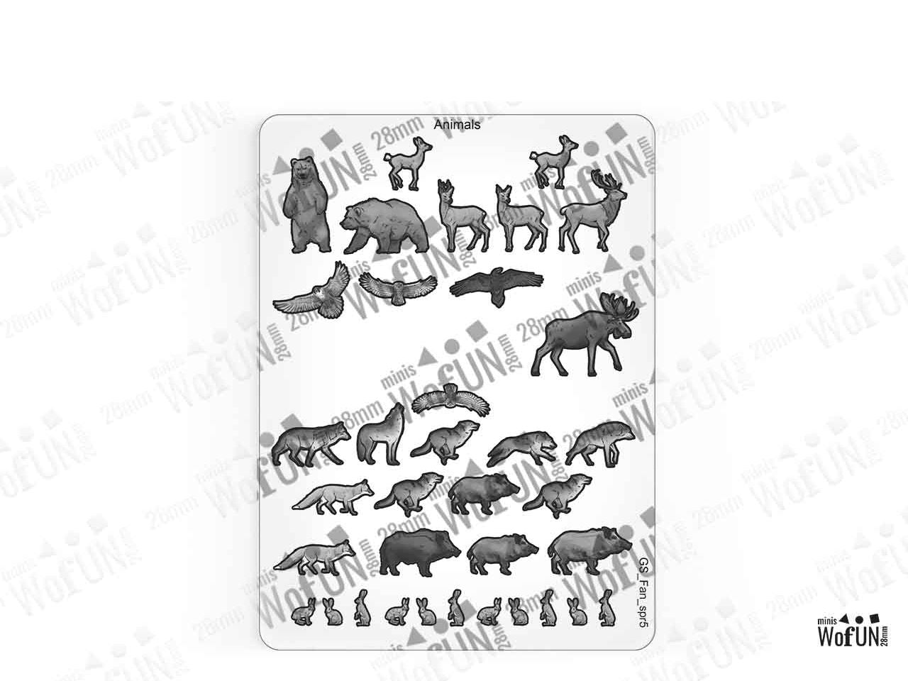 The Animals Set is crafted on a single 15x20 cm Plexiglass sprue and includes 36 figurines at the 28 mm scale.