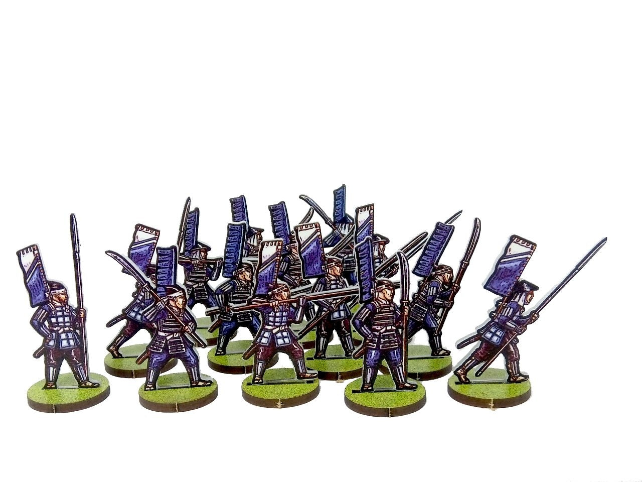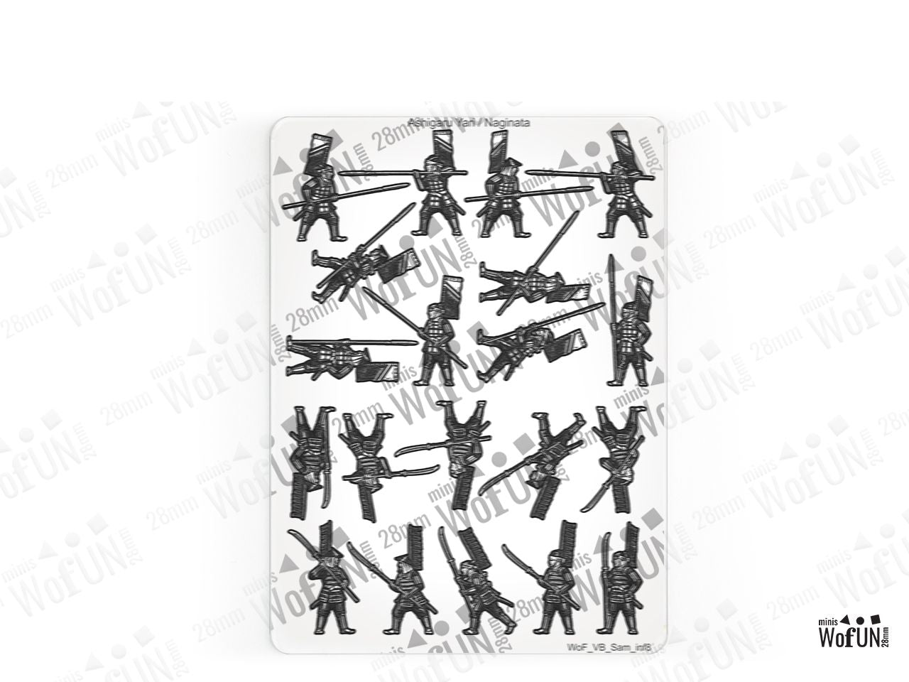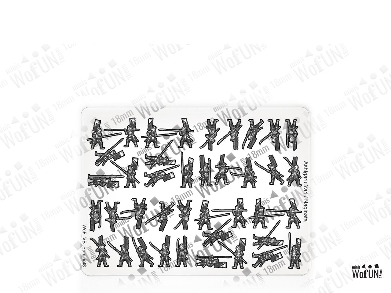 The Ashigaru Yari/Naginata Set is crafted on a 15x20 cm Plexiglass sprue and includes: