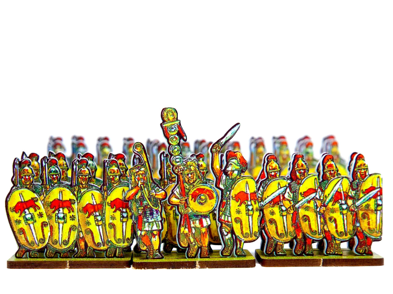 The Caesar’s infantry, yellow, bull shield Set is crafted on a 15x20 cm Plexiglass sprue and includes: