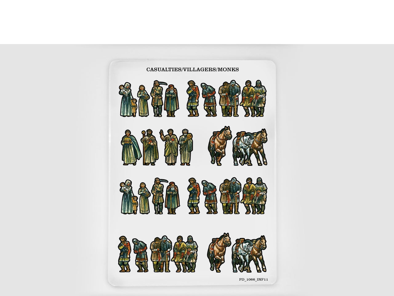 The Casualties/Villagers/Monks Set is crafted on a 15x20 cm Plexiglass sprue and includes: