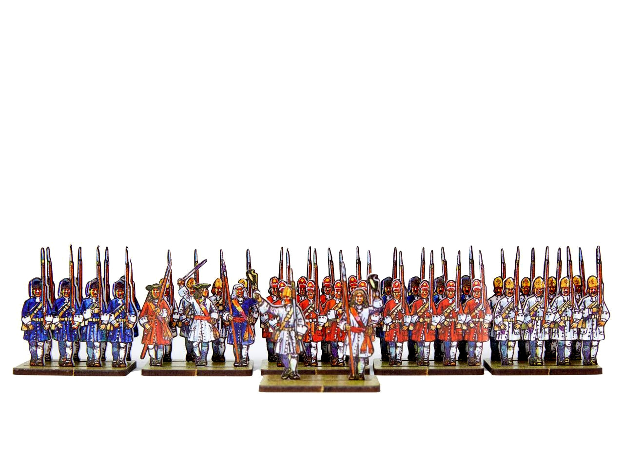 The Dutch Grenadiers (red, blue and white uniforms) Set is crafted on a 15x20 cm Plexiglass sprue and includes: