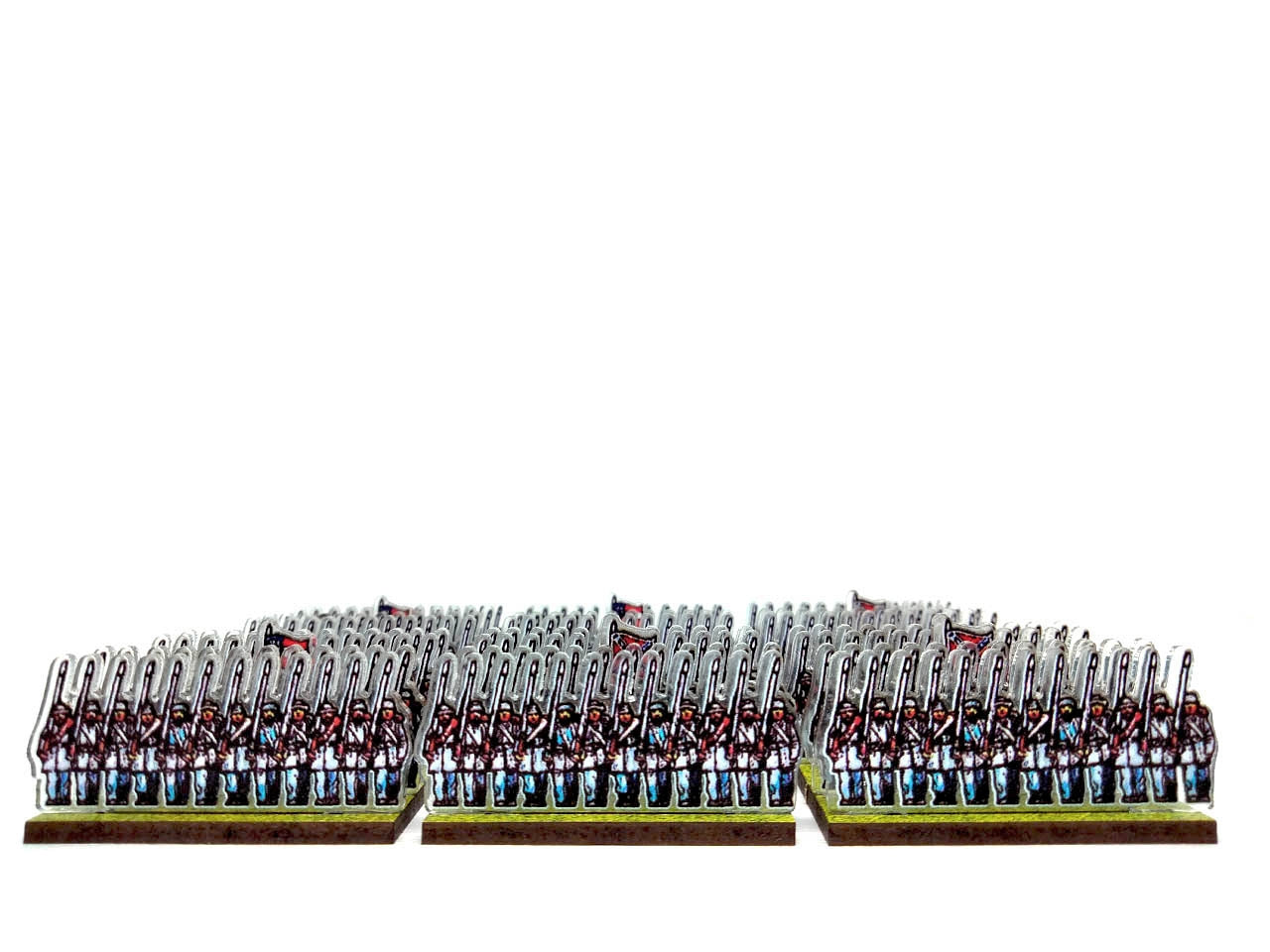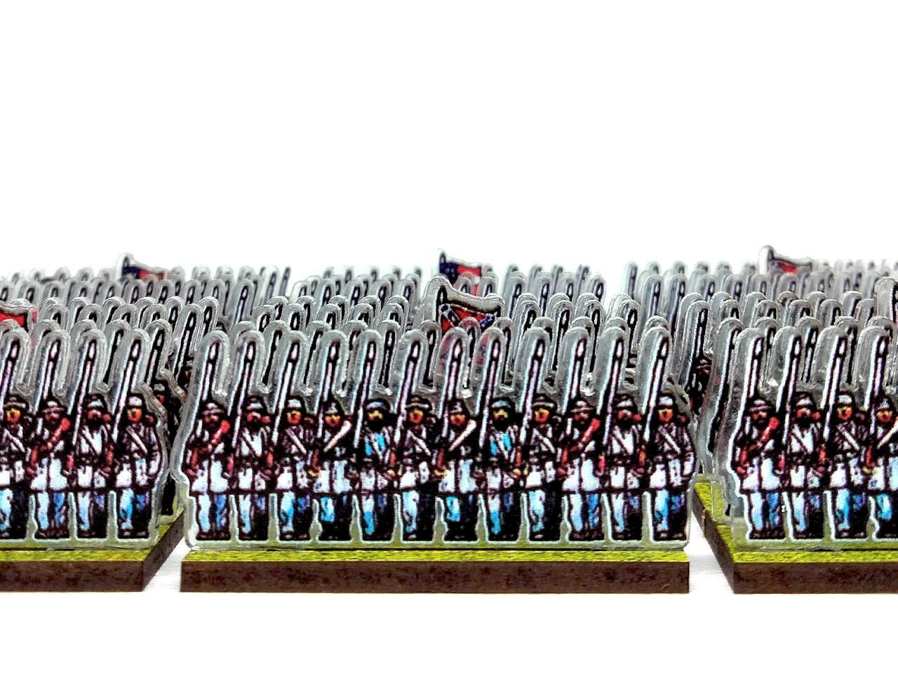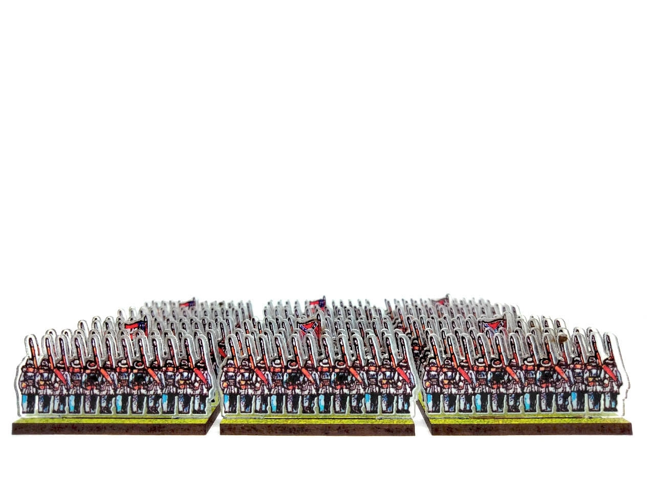 The bases are made from MDF (2.5 mm thick), have pre-cut slots in which the figurines are easily inserted, and are printed on one side with a green (grass) texture.