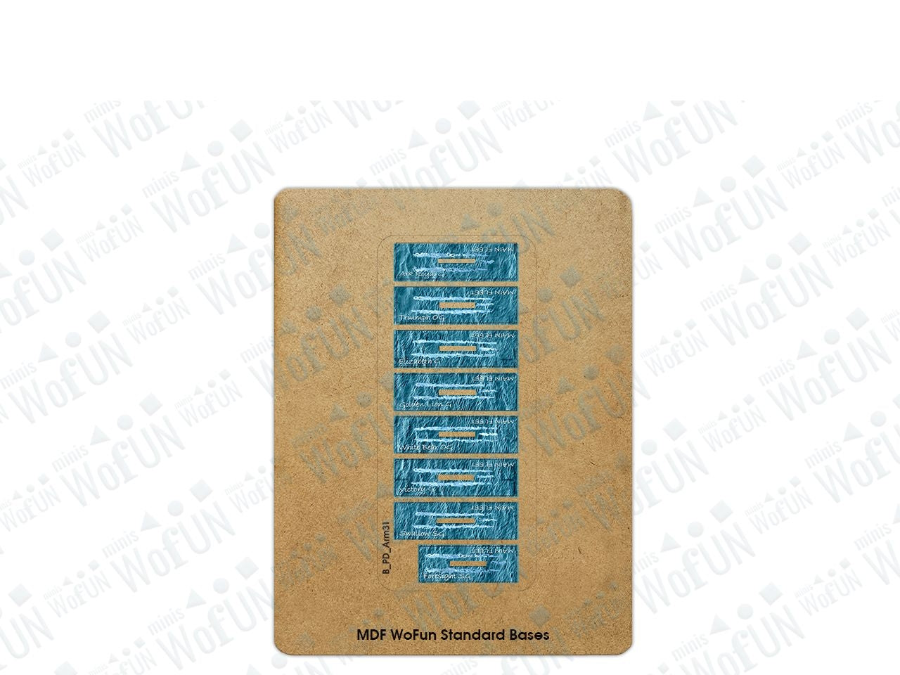 What is the WoFun Standard Bases option?By selecting the WoFun Standard Bases option, you'll receive all the bases required for each set of miniatures. The base types vary by collection and miniatures type. PD, KC, JP, SC and WoF collections include bases with two ranks suited for groups of figurines, while VB and GS Signature Editions (for skirmish wargaming) feature bases for individual figurines, ranging from 15mm to 4cm.