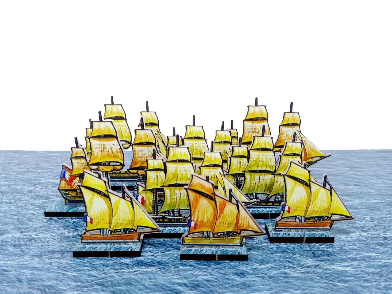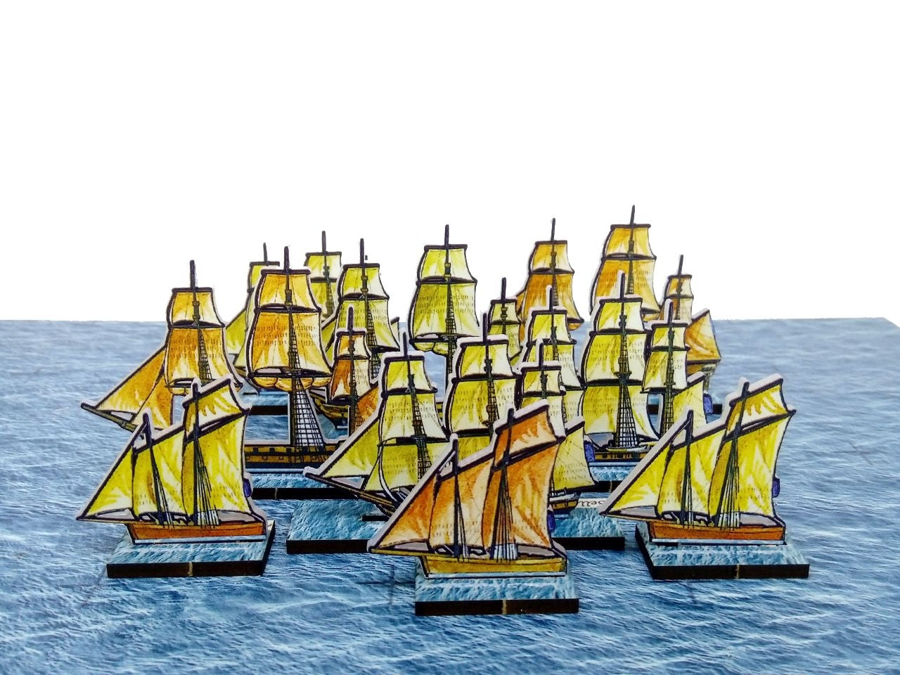 To enjoy fast wargaming, make sure to select the WoFun Standard Bases option. WoFun's Standard Bases are made from MDF (2.5 mm thickness) printed in blue (seawater texture) on one side and pre-cut with slots to hold the figurines. The bases are 15mm wide and match the length of each ship.