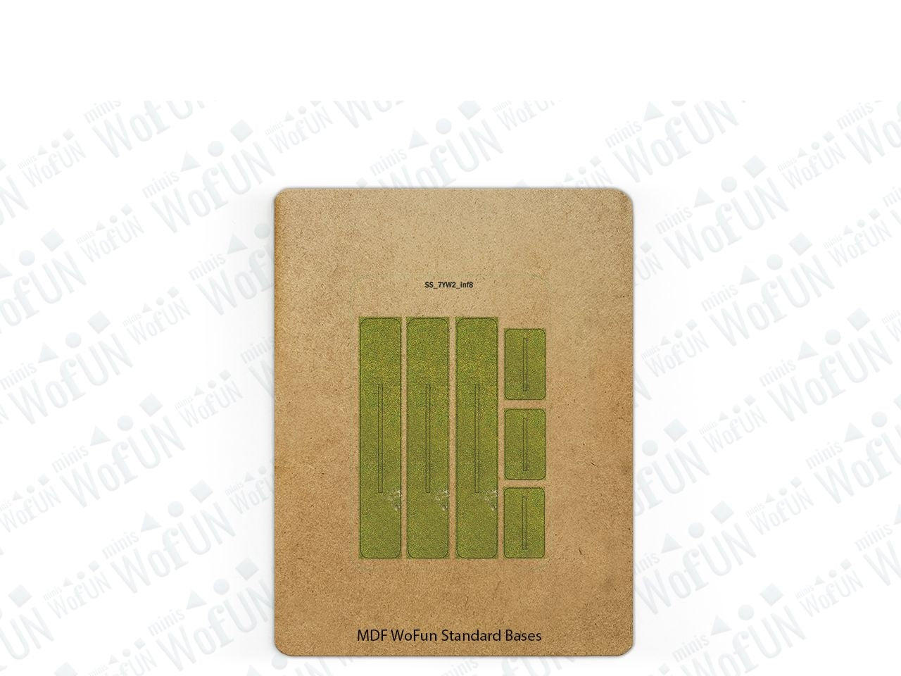 WoFun's Standard Bases for Soldier Shop collections are made from MDF (2.5mm thickness) printed in green (grass texture) on one side and a pre-cut slot to hold the figurines. French Infantry Regiment Penthievre, French Infantry Regiment Le Roi Addon has 6 bases shown in the images of the product. We created five models of bases for SoldierShop collections as follows: 120mm x 20mm, 80mm x 20mm, 60mm x 20mm, 35mm x 20mm, 20mm x 20mm.