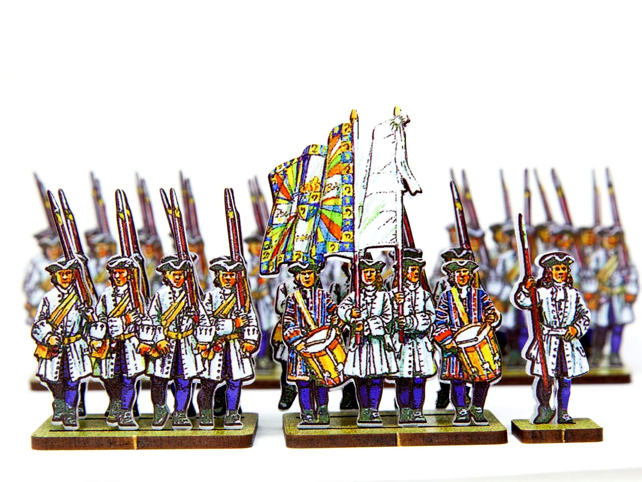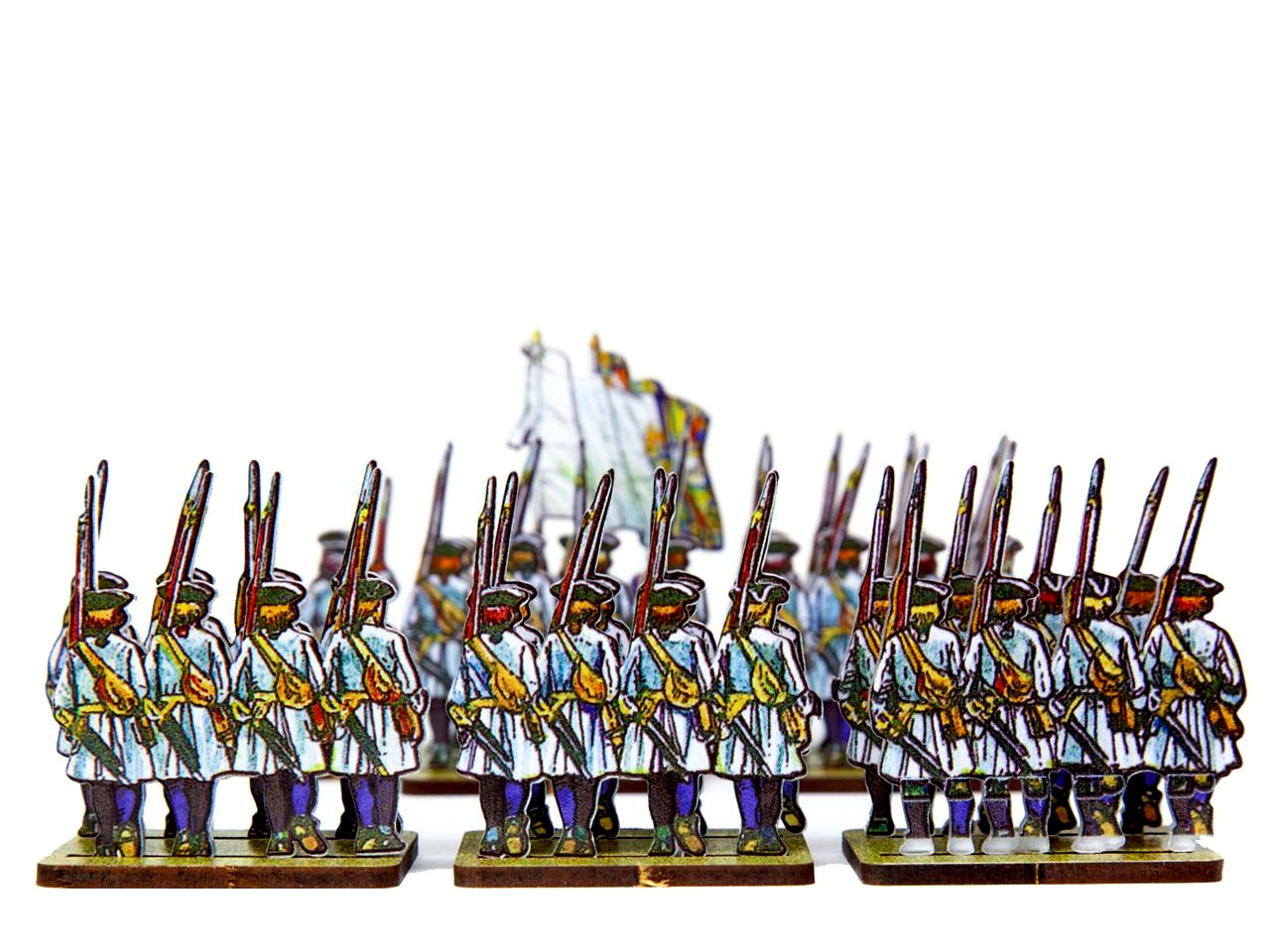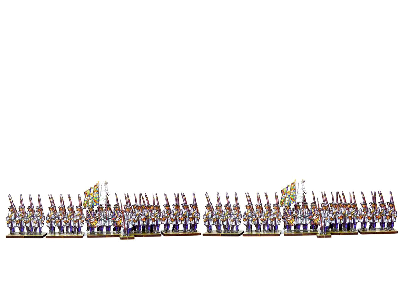 The French Line Infantry Dauphin (blue facings & blue stockings) Set is crafted on a 15x20 cm Plexiglass sprue and includes: