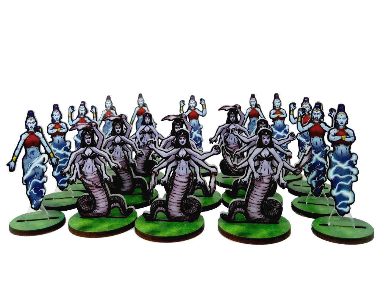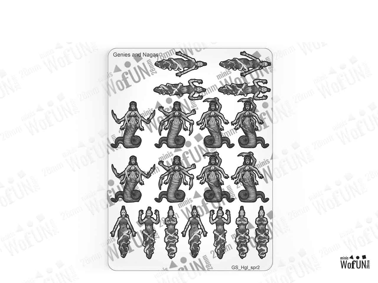 The Genies and Nagas (The Tower) Set is crafted on a single 15x20 cm Plexiglass sprue and includes 19 figurines at the 28 mm scale.