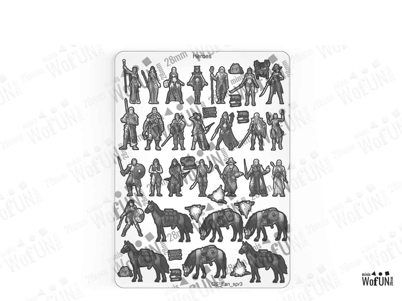 The Heroes Set is crafted on a single 15x20 cm Plexiglass sprue and includes 28 figurines at the 28 mm scale.