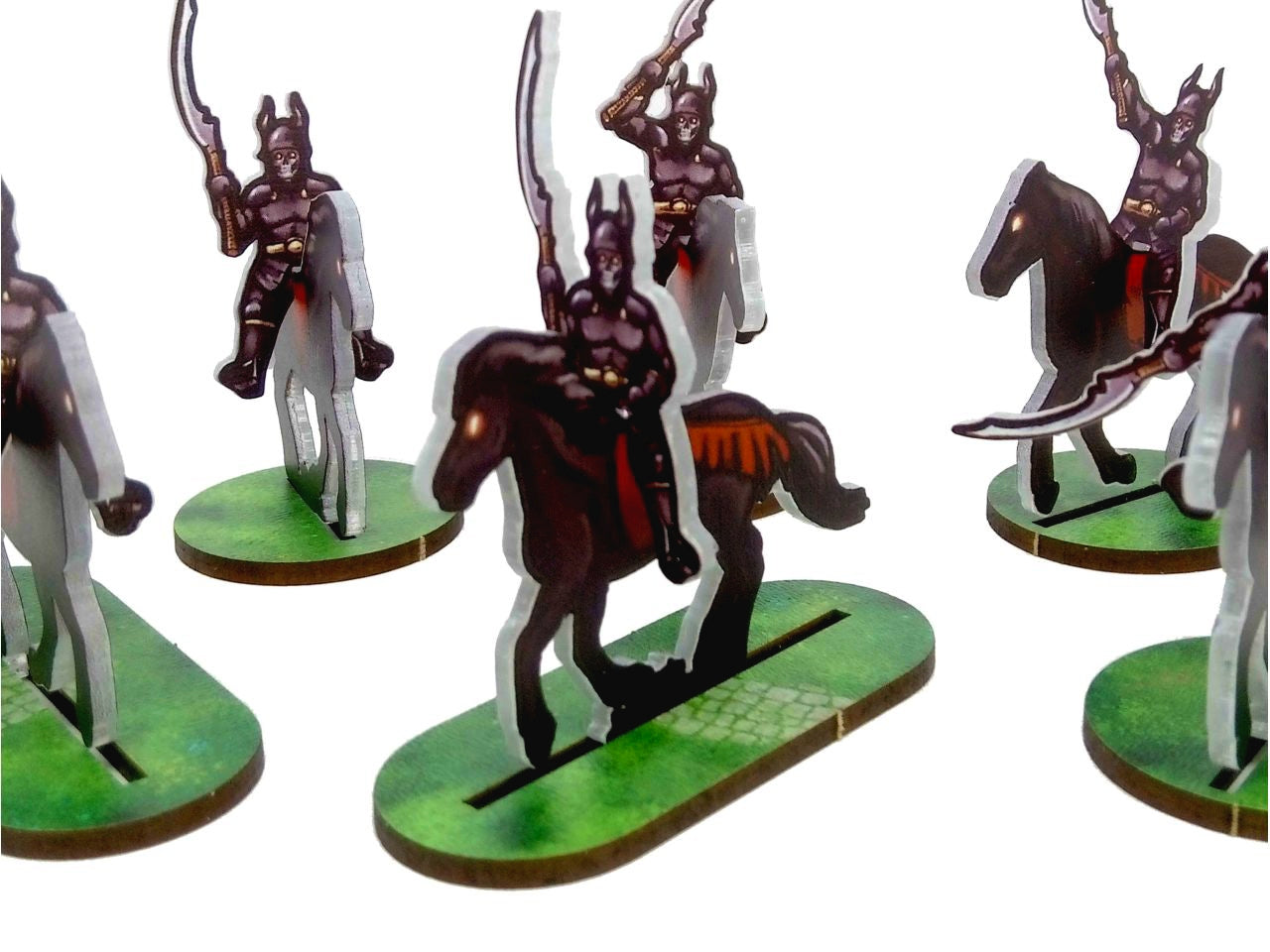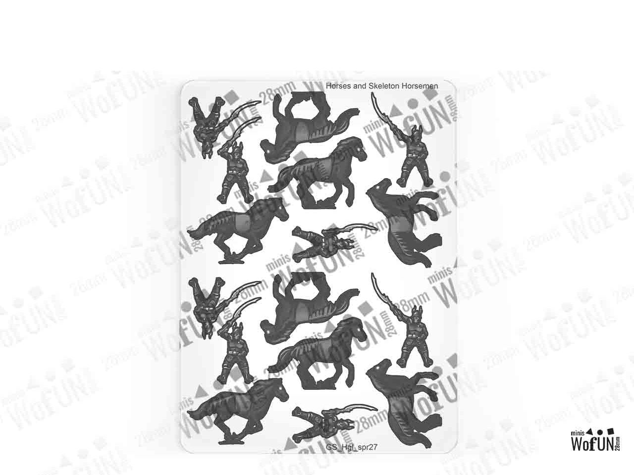 The Horses and Skeleton Horsemen (Necropolis) Set is crafted on a single 15x20 cm Plexiglass sprue and includes 16 figurines at the 28 mm scale.