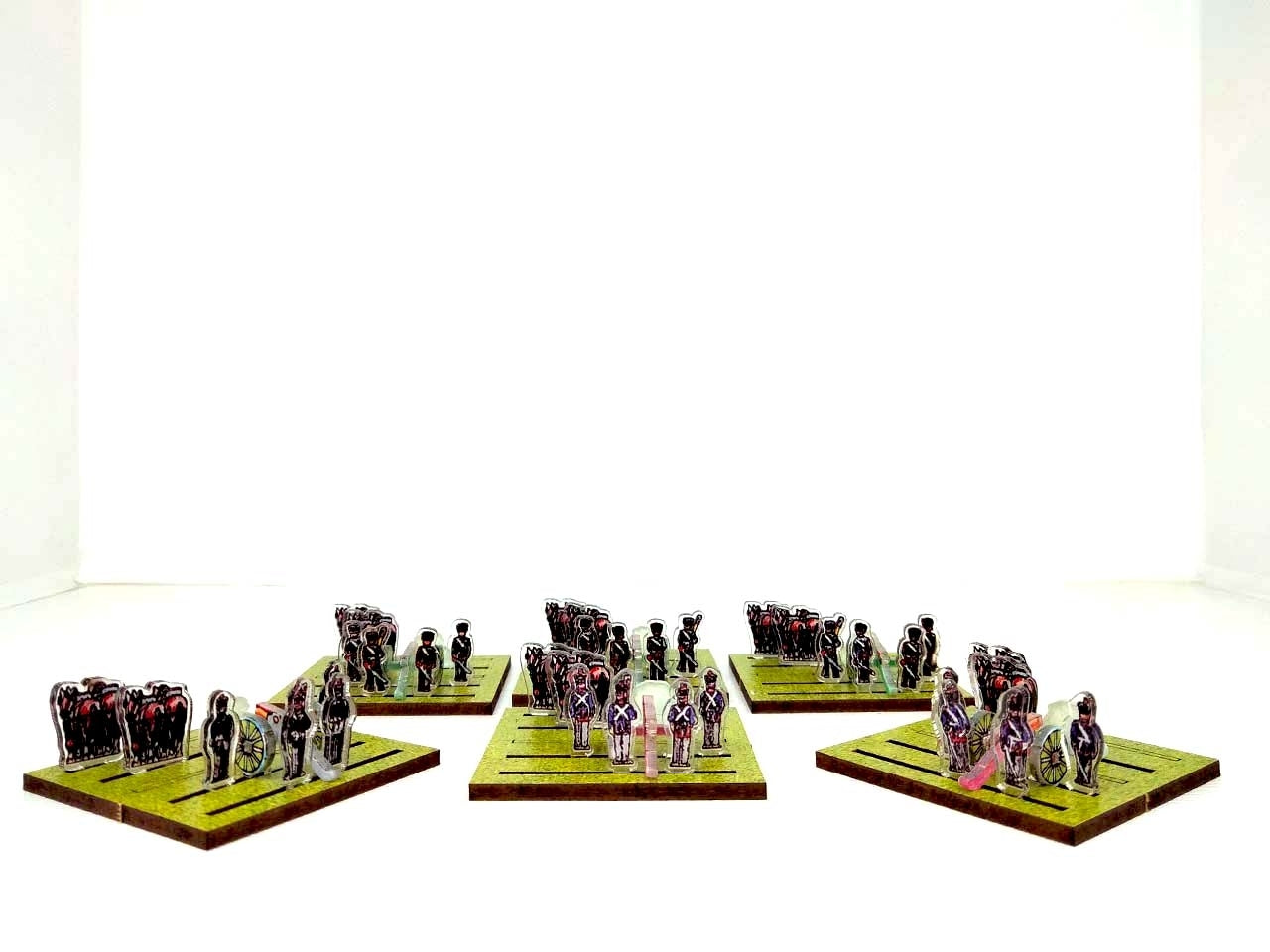 The bases are made from MDF (2.5 mm thick), have pre-cut slots in which the figurines are easily inserted, and are printed on one side with a green (grass) texture.