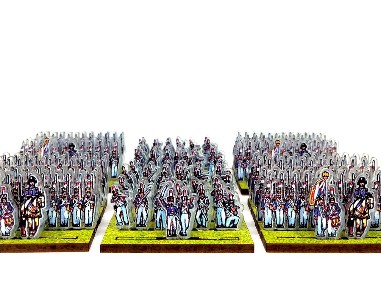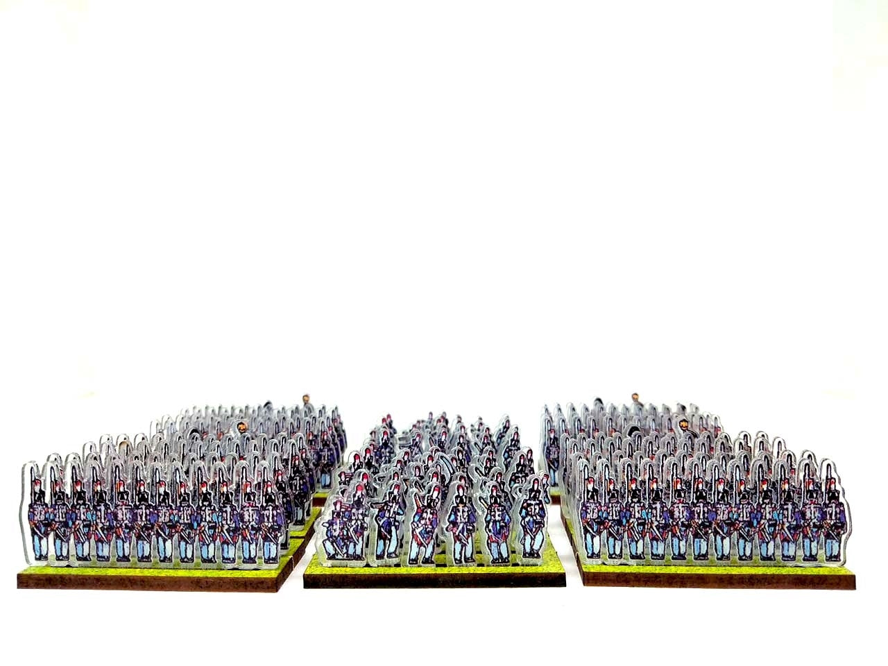 The bases are made from MDF (2.5 mm thick), have pre-cut slots in which the figurines are easily inserted, and are printed on one side with a green (grass) texture.