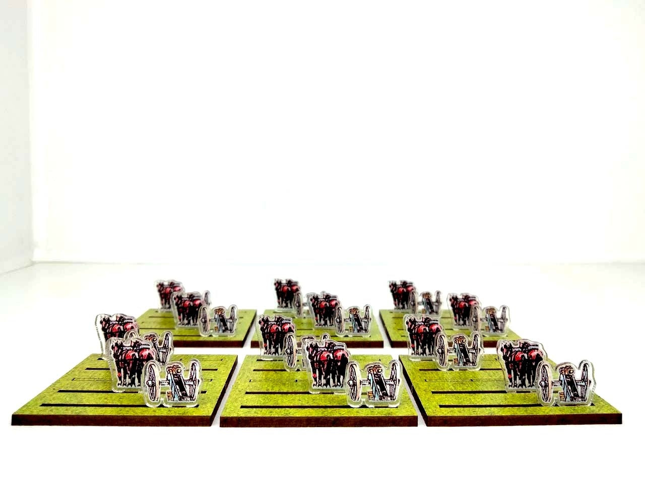 The bases are made from MDF (2.5 mm thick), have pre-cut slots in which the figurines are easily inserted, and are printed on one side with a green (grass) texture.
