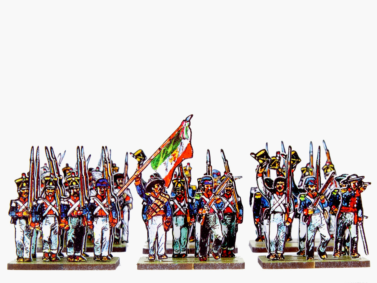 The Mexican Grenadiers and Light Companies Set is crafted on a 15x20 cm Plexiglass sprue and includes: