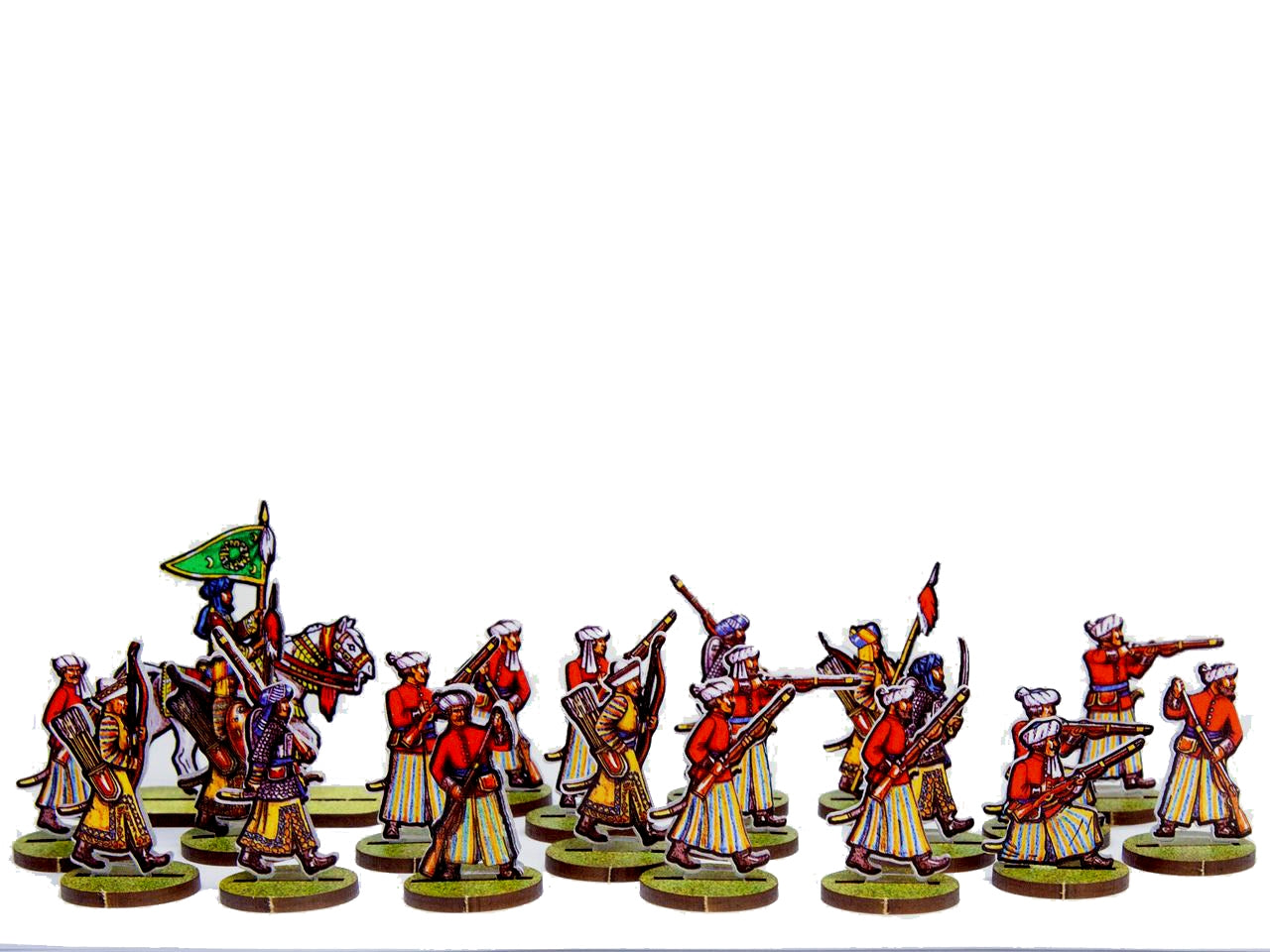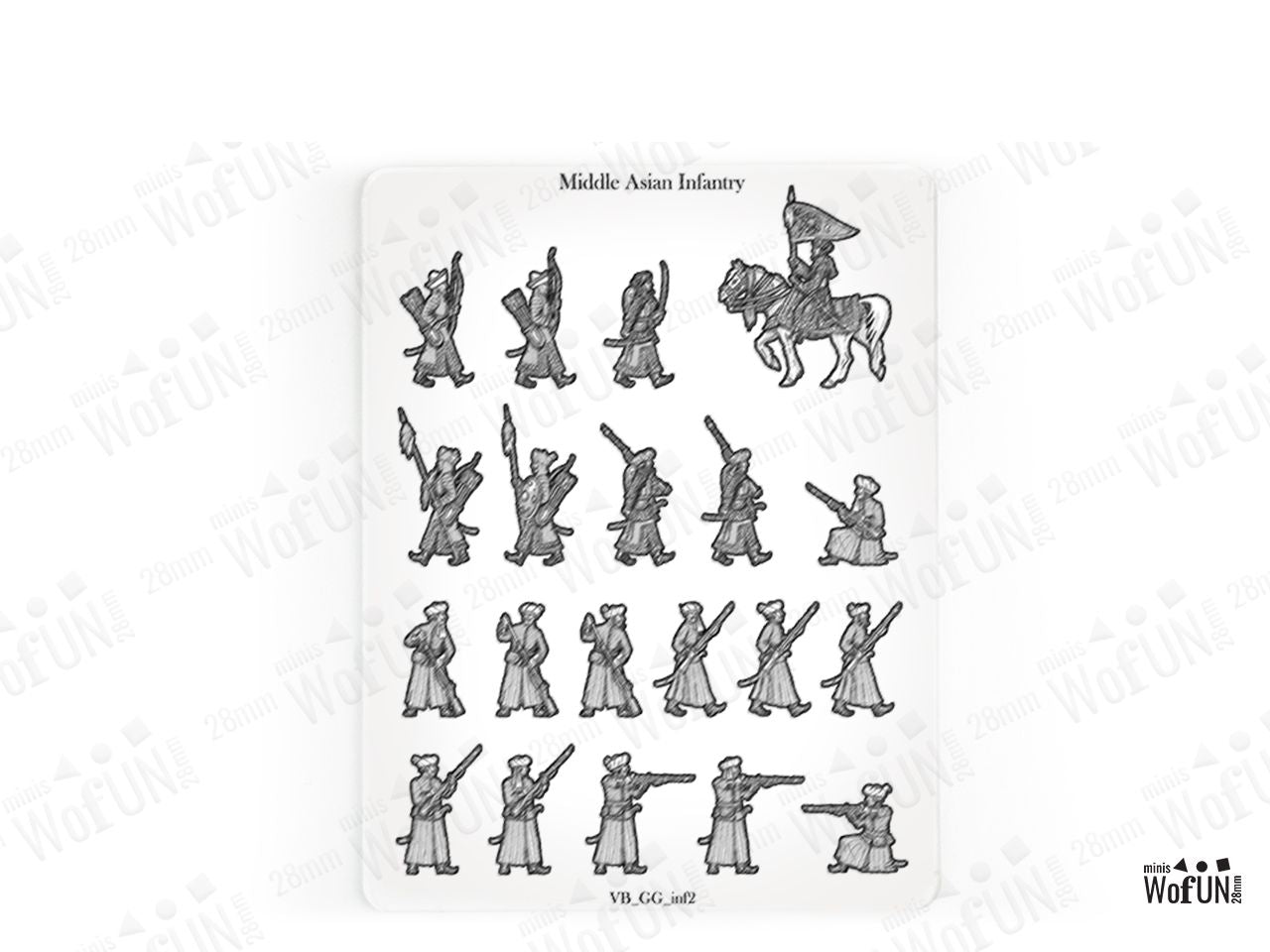 The Middle Asian Infantry Set is crafted on a 15x20 cm Plexiglass sprue and includes: