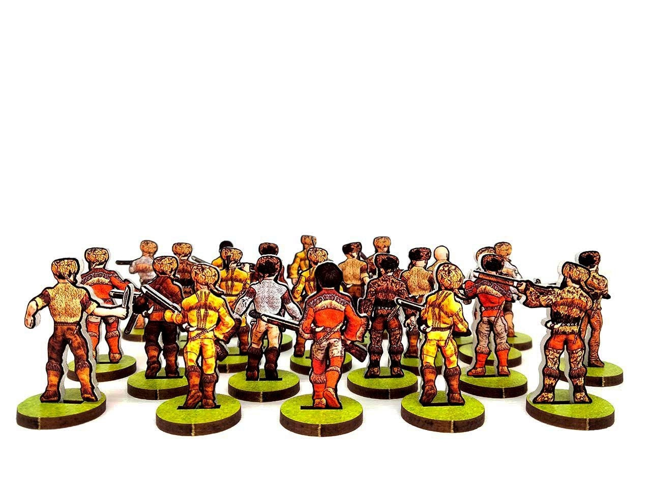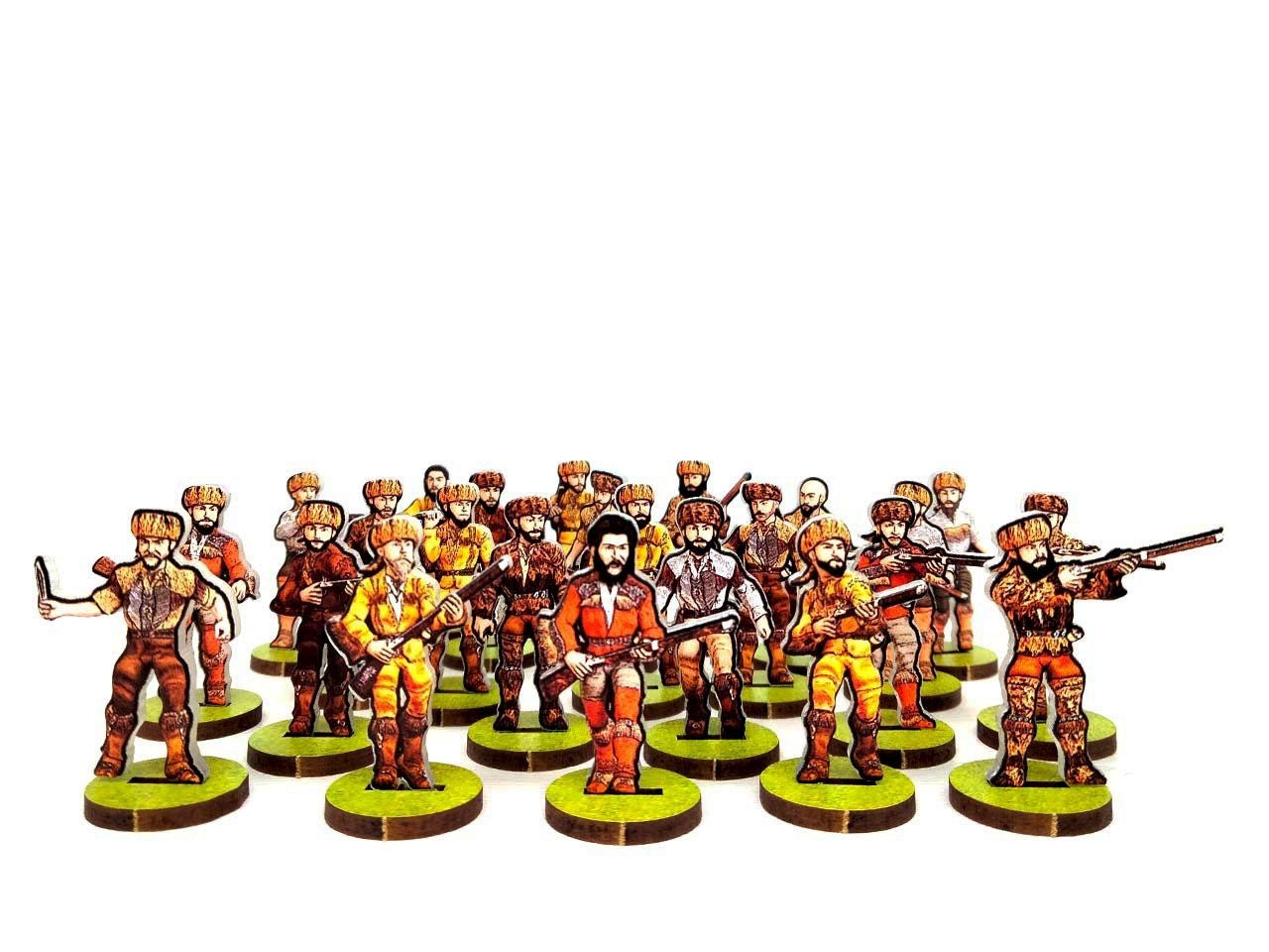 WoFun's Standard Bases are made from MDF (2mm thickness) printed in green (grass texture) on one side and pre-cut with slots to hold the figurines. The bases are 25 mm wide for the 28 mm scale or 15 mm for the 18 mm scale.