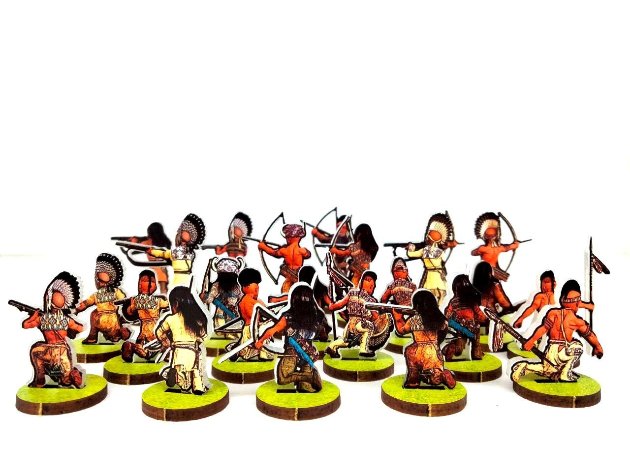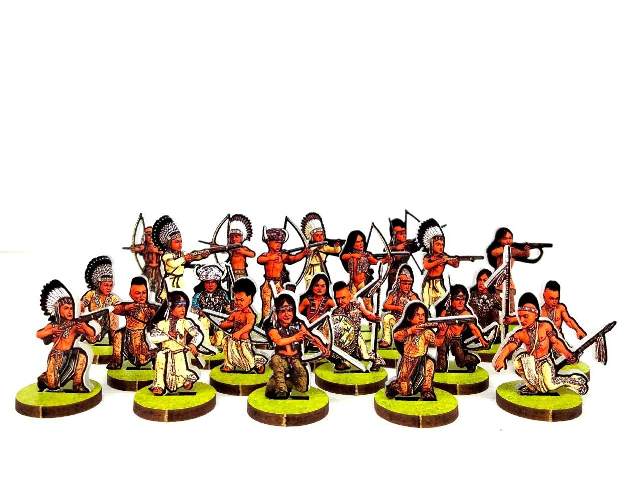 WoFun's Standard Bases are made from MDF (2mm thickness) printed in green (grass texture) on one side and pre-cut with slots to hold the figurines. The bases are 25 mm wide for the 28 mm scale or 15 mm for the 18 mm scale.