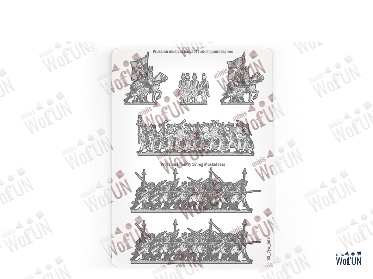 The content of the Prussian Musical Band of Turkish Jannissaires, Prussian Infantry 18 Reg. Musketeers Addon is presented in the product's images.