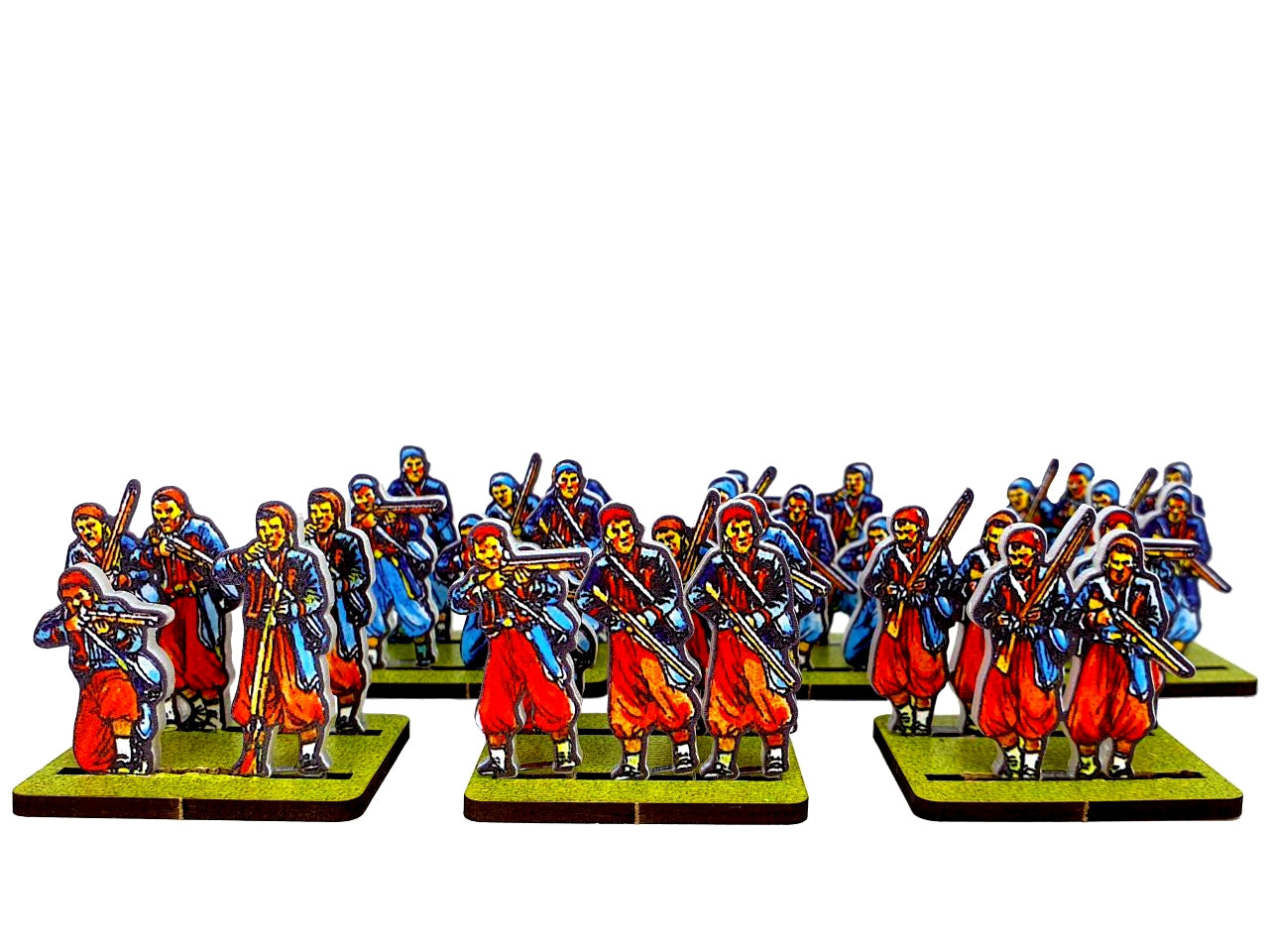 The Red & Blue Zouves Skirmishers Set is crafted on a 15x20 cm Plexiglass sprue and includes: