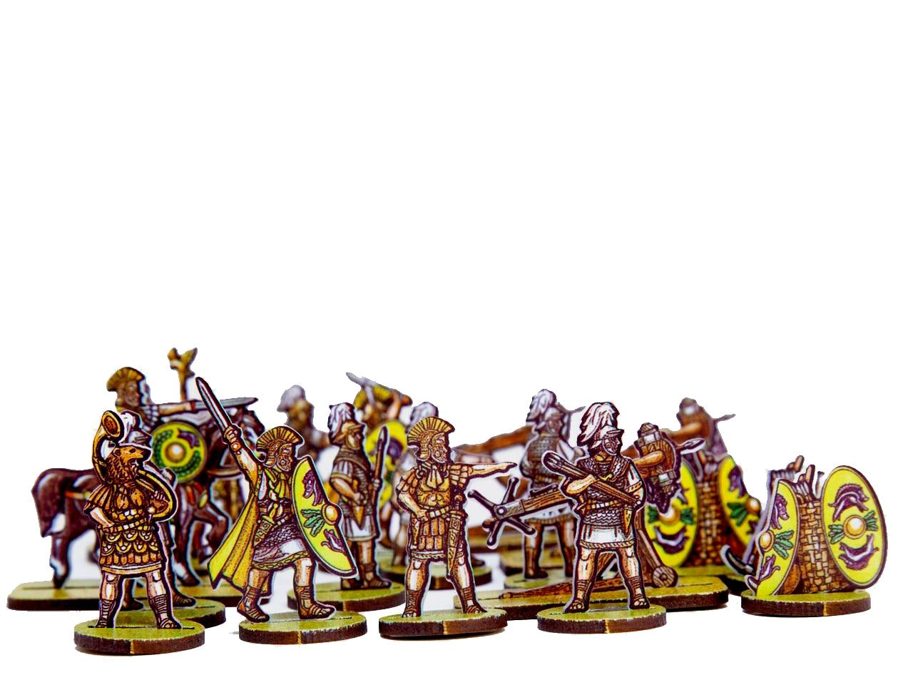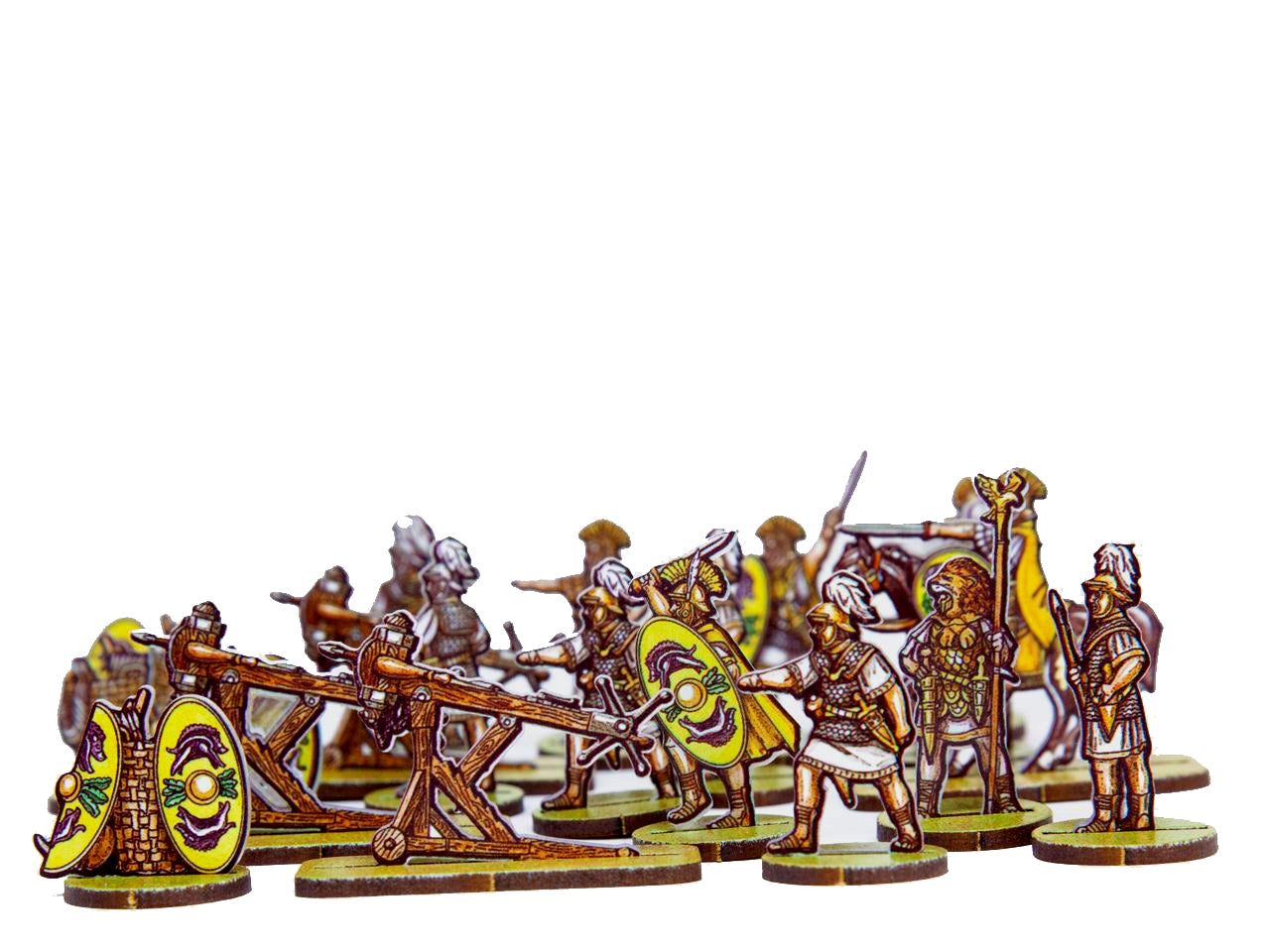 The Roman Artillery & Commanders 2 (Yellow Shields) Set is crafted on a 15x20 cm Plexiglass sprue and includes: