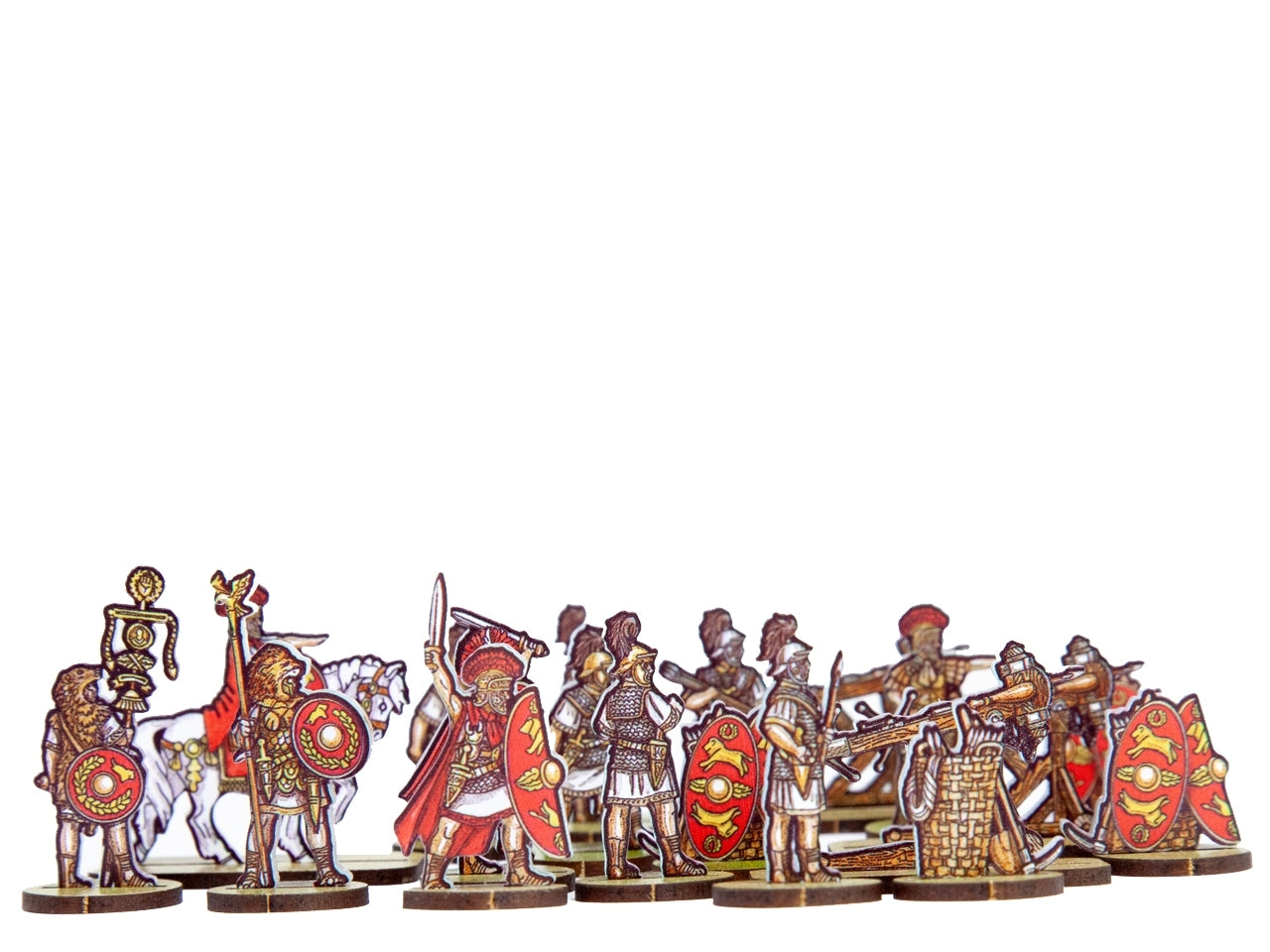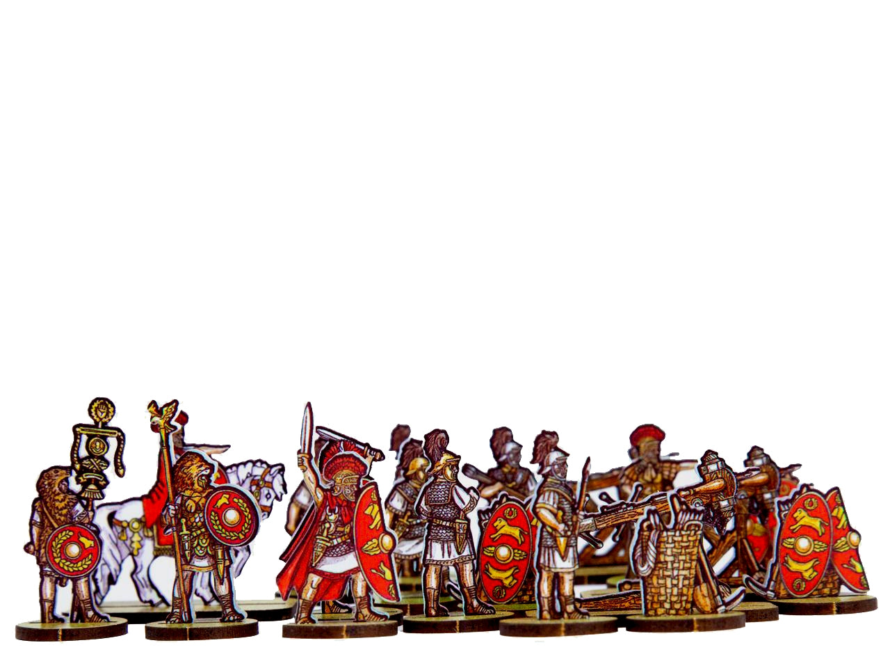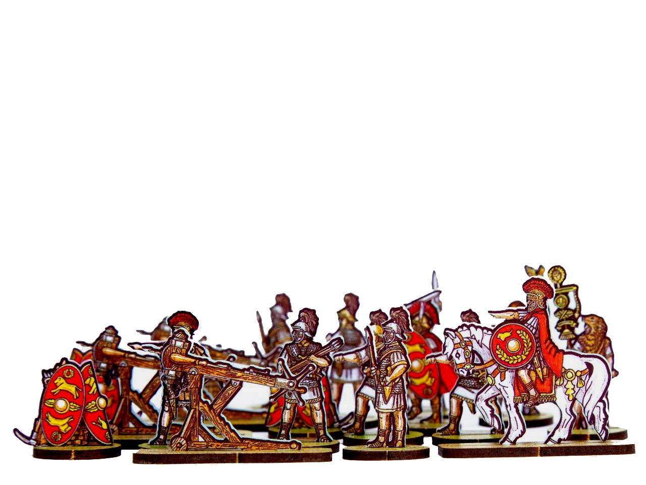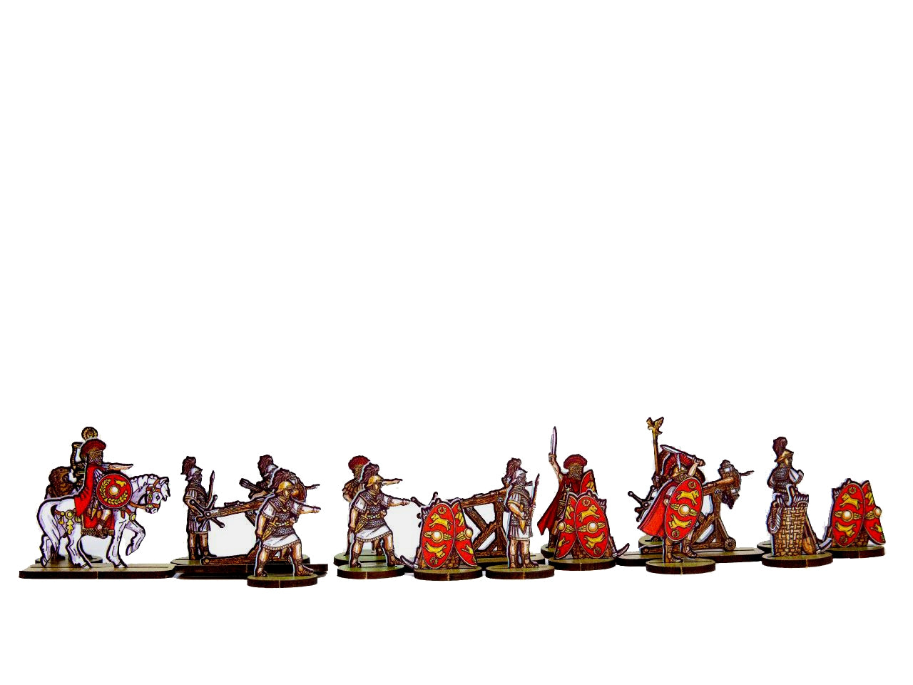 The Roman Artillery & Commanders 4 (Red Shields) Set is crafted on a 15x20 cm Plexiglass sprue and includes: