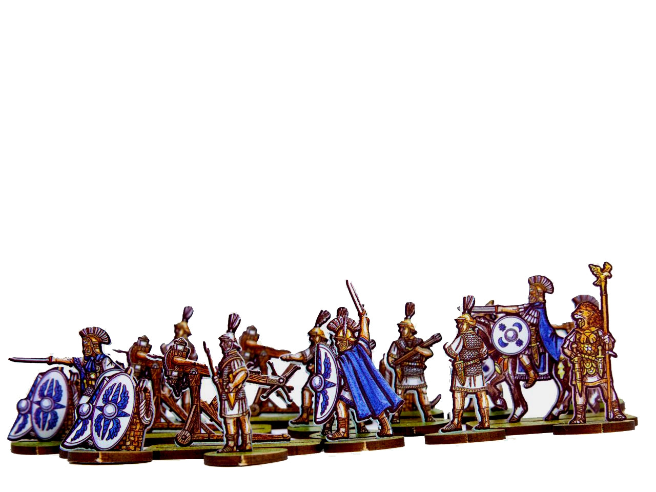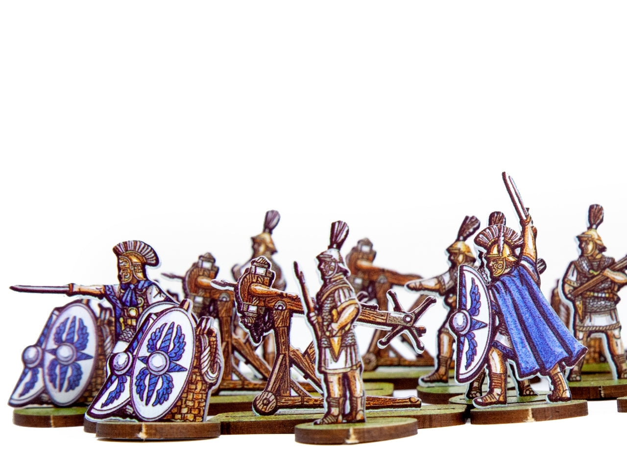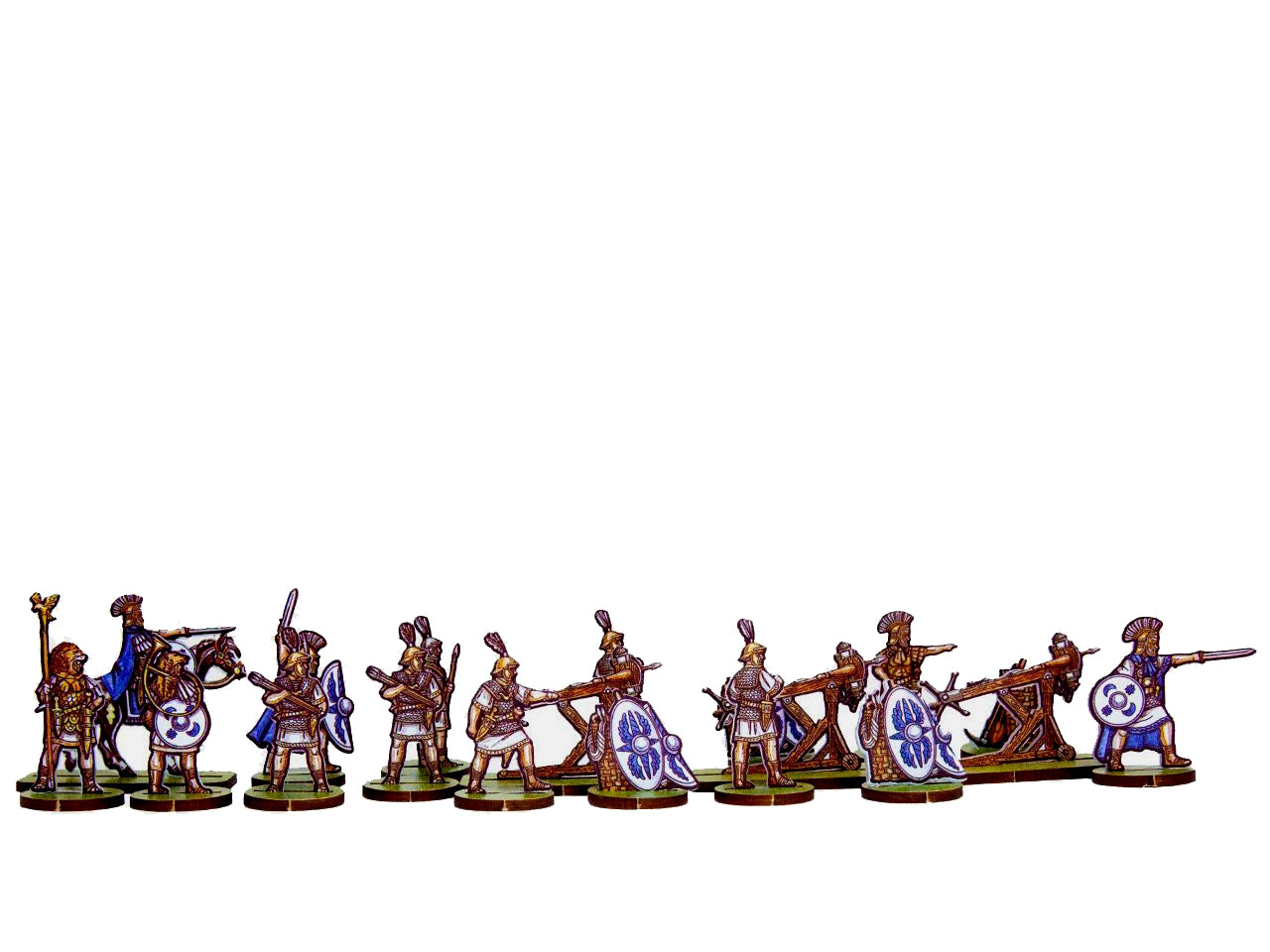 The Roman Artillery & Commanders 6 (White Shields) Set is crafted on a 15x20 cm Plexiglass sprue and includes: