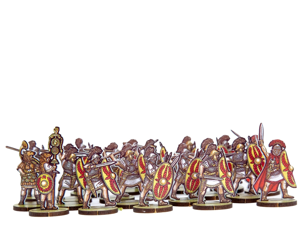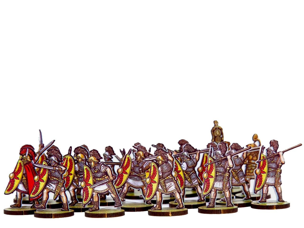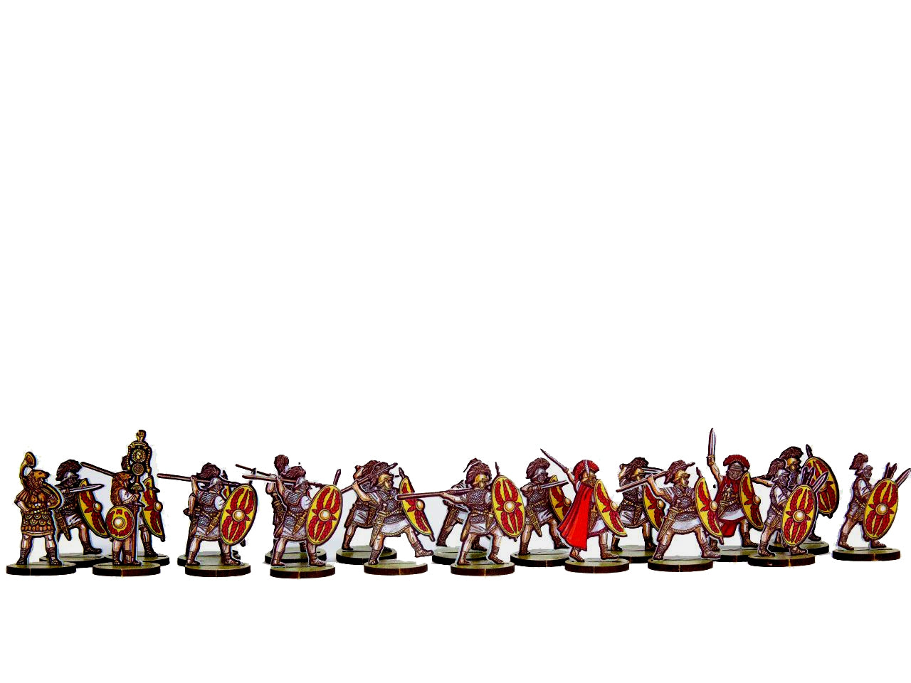 The Roman Infantry 5 (Yellow/Red Shileds) Set is crafted on a 15x20 cm Plexiglass sprue and includes: