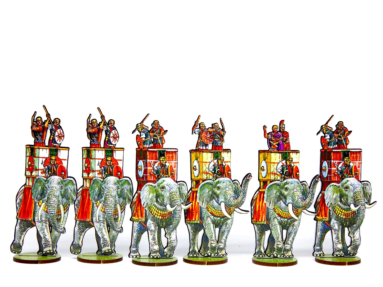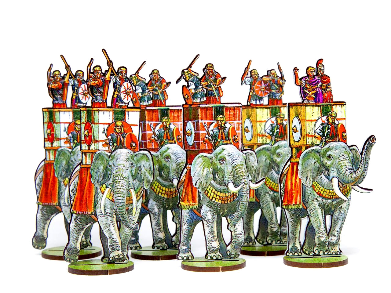 The Roman War Elephants Set is crafted on a 15x20 cm Plexiglass sprue and includes: