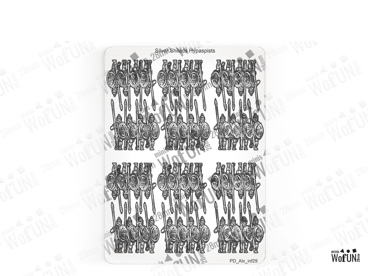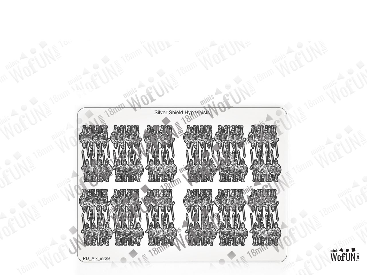 The Silver Shields Hypaspists Set is crafted on a 15x20 cm Plexiglass sprue and includes: