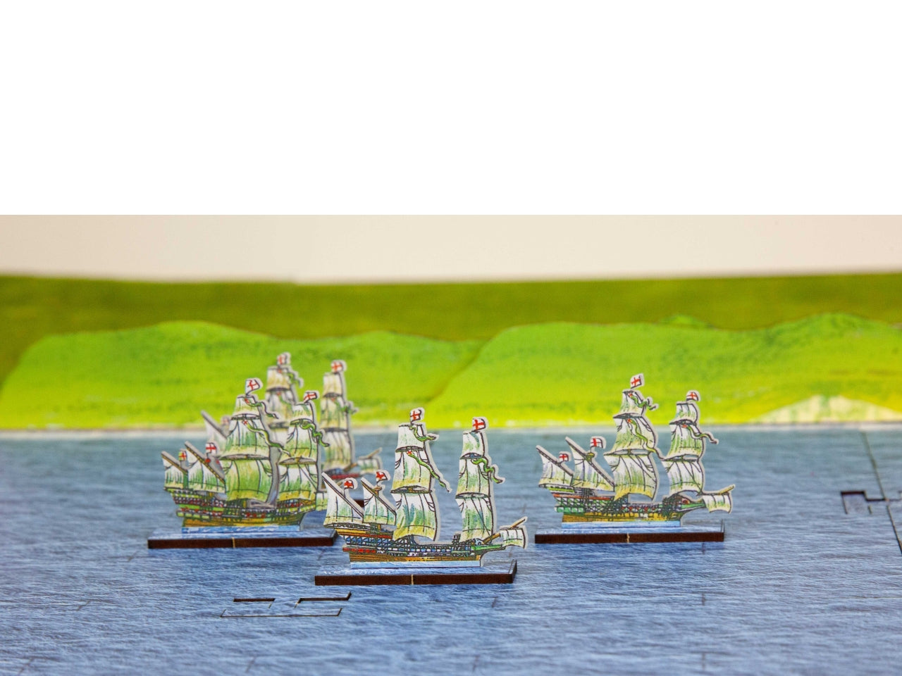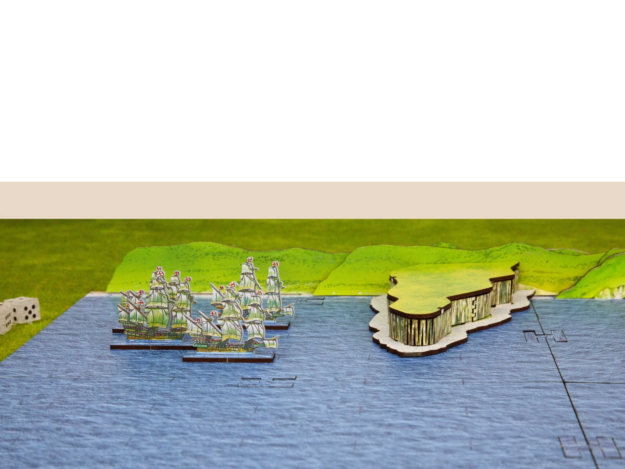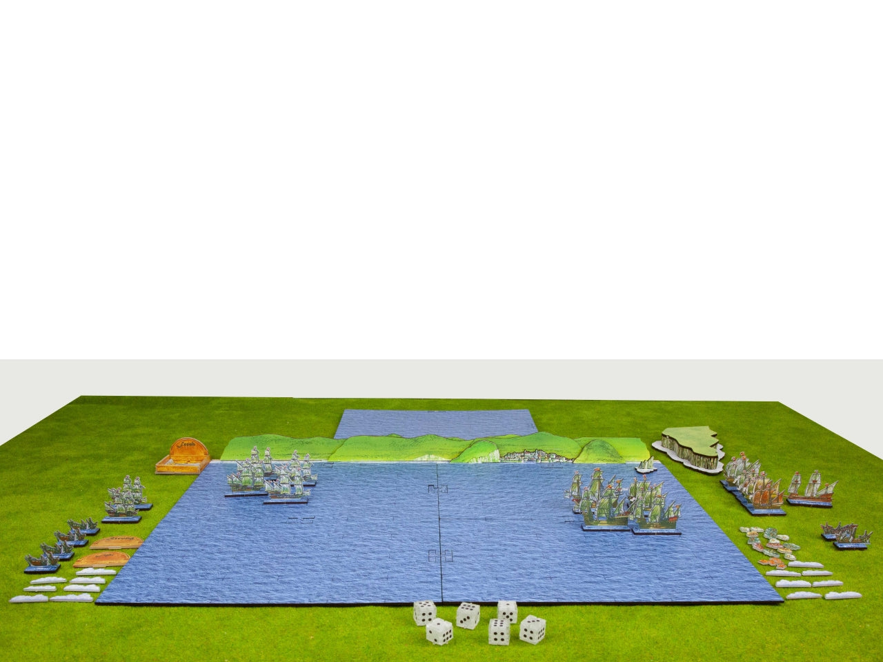 Game Board Option includes 4 MDF boards (20 cm x 15 cm each) connected between them (40 cm x 30 cm in total) and 2 extra boards you can use to extend the classic board. The option also includes the MDF shore and the peninsula illustrated by Peter Dennis and needed in the advanced scenarios of the StartrPack Rules. You can also play the rules on any other sea mat from the wargames market.