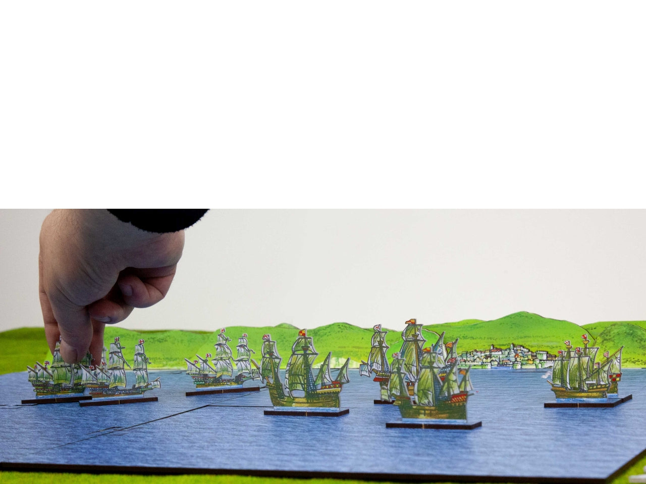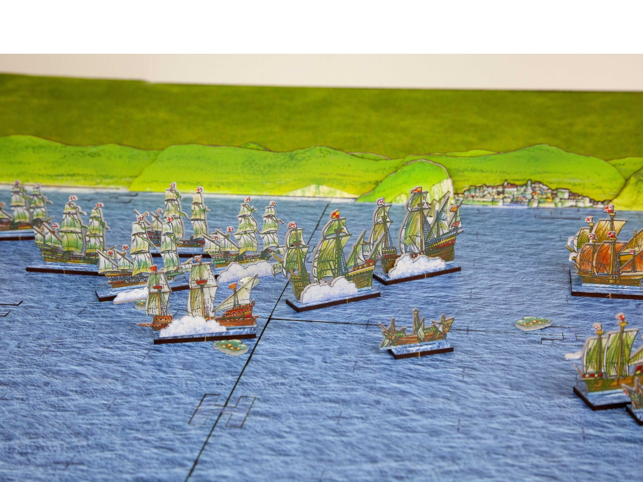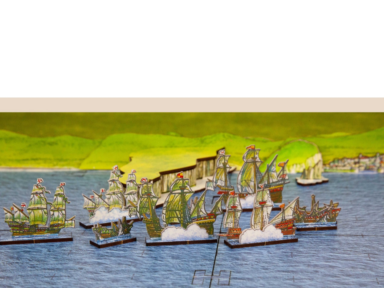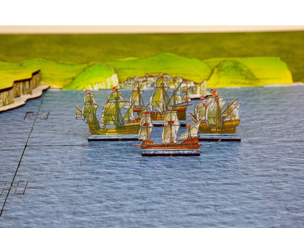 Game Board Option includes 4 MDF boards (20 cm x 15 cm each) connected between them (40 cm x 30 cm in total) and 2 extra boards you can use to extend the classic board. The option also includes the MDF shore and the peninsula illustrated by Peter Dennis and needed in the advanced scenarios of the StartrPack Rules. You can also play the rules on any other sea mat from the wargames market.