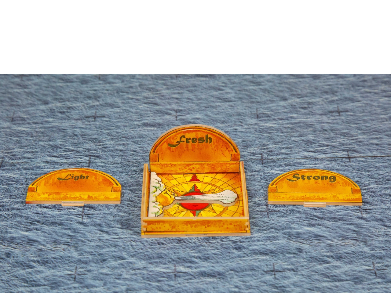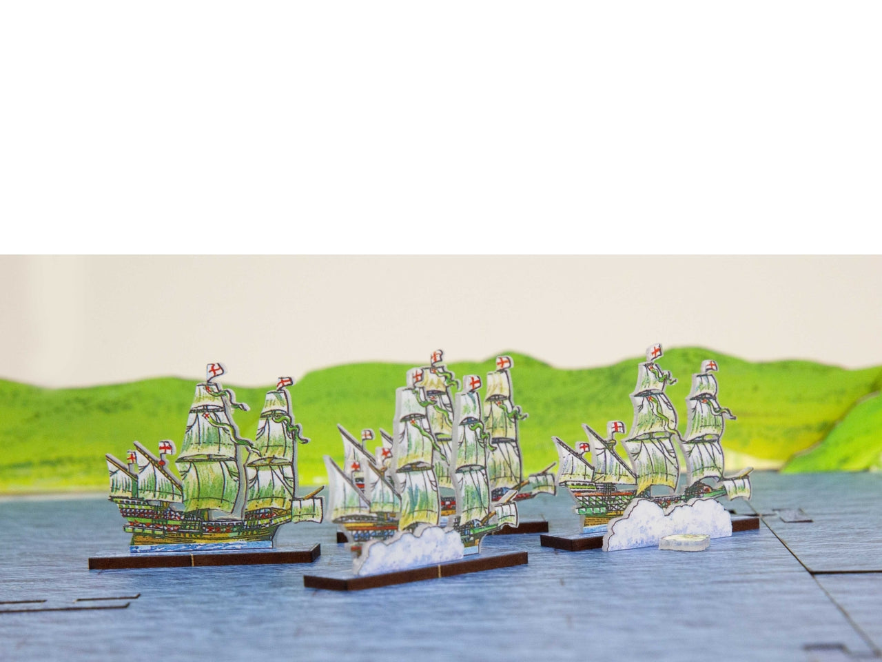 WoFun's Standard Bases Option includes bases for each ship in the pack. They are made from MDF (2.5 mm thickness) printed in blue (seawater texture) on one side and pre-cut with slots to hold the figurines. The bases are 20 mm wide and match the length of each ship. The pictures show our Minis placed on Standard Wofun Bases.