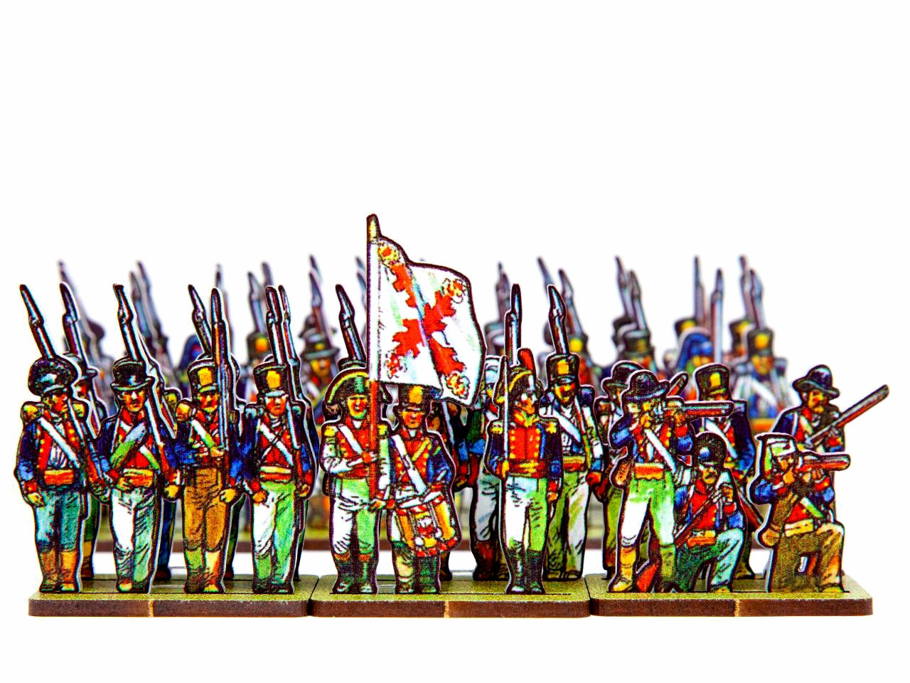 The Spanish Infantry - blue coats Set is crafted on a 15x20 cm Plexiglass sprue and includes: