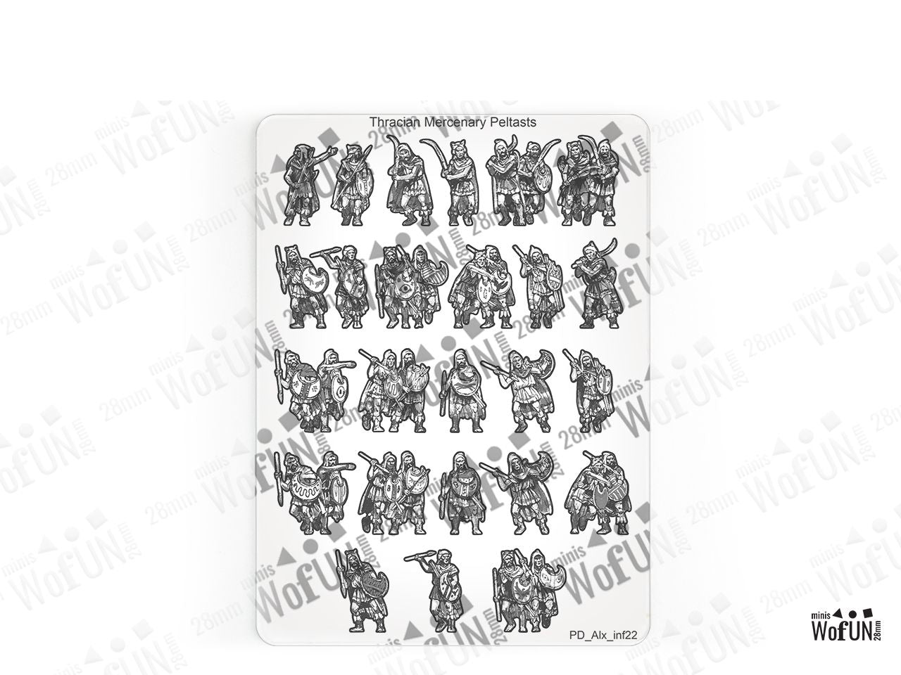 The Thracian Mercenary Peltasts Set is crafted on a 15x20 cm Plexiglass sprue and includes: